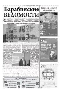 16+ № 05 (193) 13 марта 2024 года Распространяется бесплатно ВАША ГОРОДСКАЯ ГАЗЕТА Администрация города Барабинска > Мы в Одноклассниках Мы в Вконтакте > > Наш Рутуб-канал Наш Телеграмм-канал > Аккаунты главы города Барабинска > В Вконтакте В Одноклассниках > > Сайт администрации города Барабинска Мы в сети интернет: В Барабинске открылась выставка, посвящённая погибшим в ходе СВО военнослужащим 6 марта в Барабинском краеведческом музее состоялось открытие экспозиции «Своих не забываем…Погибшие участники СВО Барабинского района», на которой представлены личные вещи участников СВО и планшетная выставка с фотографиями 49 барабинцев, погибших в зоне проведения специальной военной операции на Украине. На открытии собрались близкие героев спецоперации, их друзья. С о с л о в а м и п р и в е т с т в и я и скорби к участникам м е р о п р и я т и я обратились глава города Барабинска Р о м а н Б о б р о в , заместитель главы а д м и н и с т р а ц и и Барабинского района Алексей Пильников, с о ц и а л ь н ы й координатор Филиала Государственного Фонда поддержки участников специальной военной операции «Защитники Отечества» по Новосибирской областиМаринаПесчанко, военный комиссар г. Барабинска, Барабинского и Здвинского районов Алексей Груздь. «Хочу выразить слова искренней благодарности мамам наших ребят, погибших в СВО, за достойное воспитание своих детей. Выражаю слова признательности близким военнослужащих. 4 марта подписано постановление главы города Барабинска по увековечиванию памяти наших бойцов, сейчас мы начинаем большую работу по определению месторасположения мемориального комплекса погибшим военнослужащим в ходе проведения специальной военной операции на территории Барабинска. Дорогие земляки, еще раз выражаю вам вс ем слова благодарности и низкий вам поклон за ваших детей, братьев. Своих не бросаем. Если у вас появятся какие - т о п р о б л е м ы , п о н а д о б и т с я помощь в решении в о п р о с о в , д в е р и н а ш е й а д м и н и стр а ц и и всегда открыты для вас» , - отметил глава города Барабинска Роман Бобров. На презентации прозвучали трогательные композиции в исполнении солистки Образцового самодеятельного коллектива «Шалунишки» Златы Завориной. В память о погибших барабинцах была объявлена минутамолчания. Экспозиция будет работать в краеведческом музее на постоянной основе. Посетить ее могут все желающие. Весенние события в Барабинске