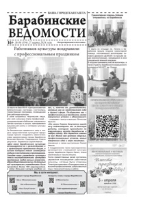 16+ № 06 (194) 27 марта 2024 года Распространяется бесплатно ВАША ГОРОДСКАЯ ГАЗЕТА Администрация города Барабинска > Мы в Одноклассниках Мы в Вконтакте > > Наш Рутуб-канал Наш Телеграмм-канал > Аккаунты главы города Барабинска > В Вконтакте В Одноклассниках > > Сайт администрации города Барабинска Мы в сети интернет: Работников культуры поздравили с профессиональным праздником Гуманитарная помощь бойцам отправилась из Барабинска 13 марта на площади им. Ленина в Ба - рабинске прошла погрузка гуманитарной помощи, изготовленной волонтерами ты - лового движения «ДОМОЙ» по просьбе на - ших военнослужащих, находящихся в зоне специальной военной операции. В погрузке принимали участие волонтеры, а также студенты Барабинского медицинского колледжа и БФ НКТТ им. Лунина. 26 марта на базе МКУК «Централизованная библиотечная система» состоялась торжественная программа, посвященная Дню работника культуры. В зале собрались творческие люди, для кого культура стала профессией - сотрудники музея и библиотек, специалисты Центра культуры и досуга, преподаватели музыкальной школы и колледжа культуры и искусств. За безграничную преданность делу в этот день представителей культурной сферы города пришли поздравить заместитель главы администрации города Барабинска Вячеслав Шульгин, Председатель Совета депутатов г. Барабинска Сергей Иванов. «Для меня барабинская культура ассоциируется не с развлечениями, а с организацией правильного досуга, в основе которого лежит совмещение отдыха с воспитанием и просвещением. Сегодня наши учреждения культуры стали востребованными центрами притяжения людей разных возрастов, ядромобщественнойжизни. Запрошлый год культурными учреждениями было проведено более 700 мероприятий, в этом большая заслуга каждого из вас, и, конечно же, руководителей, которые уже не представляют себя в другой сфере. Поздравляю вас с профессиональным праздником, желаю творческих успехов и вдохновения!» - поздравил присутствующих Вячеслав Шульгин. «От имени Совета депутатов города хочу поблагодарить вас за большую работу, которую проводите на территории города Барабинска в любую погоду. Все держится именно на вас! Желаю вам крепкого здоровья, профессиональных успехов, новых творческих идей и море позитива» , - подчеркнул в своем выступлении Сергей Иванов. К поздравлениям также присоединились руководители учреждений культуры города Барабинска Лариса Лелюх, Алена Овсянникова и Татьяна Ильина. После приветственных речей состоялась церемония награждения работников к ульт уры, к оторые были отмечены Почетными грамотами и Благодарностями за высокий профессионализм, добросовестный труд и творческий подход к работе.
