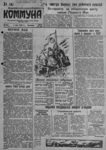 Гор. Новосибирск Областная научная библиотека 1 экз. Да зд| . щ \ь Пролетарии всехстран, соединяйтесь? КОТИЧУНЯ Орган Барабинскоге райкома ВКП(б) и райсовета депутатов трудящихся Новосибирской области смотра боевых сил рабочего класса! Вставайте на оборонную вахту имени Первого Мая Паровозники депо Барабинск обратились ко всем железнодорожникам Нарабииского отделения с предложением провести фронтовую вахту имени Первого Мая,—с 18 часов 30 апреля по 18 часов 3 мая. Паровозники вызывают рабочих я служащих доказать яаилучшие образцы слаженности всех служб и максима 1 ьного выполнения производствен* ных показателей. Сами паровозники берут на себя обязательства: обеспечить бовулречиое продвяже- ■ив поездов строго по варконевскому графину, не допустить ни единого брака в работе и обеспе чить своевременное проследование на запад всех тяжеловесных поездов, подведенных Томской до рогой. Обращение паровозников встретило горячий от клик среди железнодорожников отделения. Смена старшего осмотрщика вагонов ст. Барабинск тов. Суханова, например, не только принн> ает вызов, но и вносит встречное предложение: первого мая, по окончании смены отработать еще 4 „часа и за работанные средства передать в фонд обороны. Вставайте на оборонную вахту имени 1 Мая! ПЕРВОЕ МАЯ ^ 1 Мая 1942 года народы всего иира встре чают в суровой обстановке второй мировой войны, затеянной немецко-фашистг.кими за хватчиками. 95 процентов населения земного шара охвачено войной. Десятки миллионов людей поставлены под ружье. Народы Советского Союза встречают 1 Мая в обстановке великой отечественной освобо дительной войны против гитлеровских разбой ников, напавших на нашу страну 10 месяцев тому назад. Наша героическая Красная Ар мия крепко держит в своих руках боевую инициативу. За зиму Красная Армия освобо дила от немецких оккупантов много городов и деревень. Сильные удары наносят врагу иац<и красные партизаны. Победы Красной Армии показали всему миру мощь вооруженных сил нашей страны, прочность нашего государства, гениальность и прозорливость сталинского руководства. Красная Армия первая,которая остановила дви жение огромной военной машины Гитлера, за ставила ее повернуть назад и гоиит теперь иа Завад. К 1 Мая Красная Армия приходит окру женная симпатиями и любовью трудящихся |СССР и всех ..свободолюбивых народов. Ее ус- Ипехн вдохновляют народы всего мира на борьбу с германскими захватчиками. Народы всего мира поднимаются на борь бу с гитлеризмом — немецкими людоедами. Сегодня, в день 1 Мая лозунг: Пролетарии всех стран, соединяйтесь для борьбы с фа шизмом! — станет девизом всего передового человечества. Наша страна — единый боевой лагерь. В тылу, что на фронте, советские патриоты работают на покладая рук, вырабатывают все больше и больше самолетов, танков, винто' вок, снарядов, хлеба для фронта и страны. Победа будет за нами! Смерть немецким оккупантам! Под знаменем Ленина—Сталина—вперед, на разгром немгцко-фашистских захватчиков! л у ИЗВЛЕЧЬ УРОКИ ПЕРВЫХ ДНЕЙ Весна вступила в свои права. Погода благоприят ствует массовому развороту весенне - полевых работ. Даются все возможности закончить посевные работы в 12 - 15 рабочих дней. Однако в районе крайне медленно развертываются полевые работы. Многие председатели колхозов и ди ректоры МТС ждут еще чего - то, беспечно от