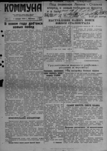 Орган Баэабинскзго райкома ВКП(б) к райсовета депутатов трудящихса Коаосибнрскоб облает № 1 1 января 1943 г., Пятница В новом году доб'енея новых побед Сегодня 1 января 1943 года. Старый, 1942 год закончился Это был год ожесточенной борьбы свободолюбивых пародов мира nptf тив черных сил реакции, про тив самых хищнических, самых разбойничьих империалистов — немецко - фашистских захватчи ков. Серьезные испытания пришлось выдержать нашей родине в ис текшем году. Устилая русскую землю горами трупов своих сол дат и офицеров, бесформенными глыбами изуродованных танков, орудий и автомашин, немцы ос тервенело рвались к берегам кра савицы Волги, к сердцу нашей страны. Над советской отчизной навис ла грозная опасность. В эти тя желые дай, когда на полях бит вы решалась судьба жизни и смерти советского государства, наш народ ни на минуту не те рял веры в победу. Враг был остановлен. Героическая оборона Сталинграда, защита Кавказа н Воронежа войдут в историю, как одна из наиболее ярких страниц великой освободительной войны. Измотав силы противника, уничтожив лучшие вражеские дивизии и большое количество техники, Красная Армия во вто рой половине ноября нанесла гитлеровским полчищам в райо не Владикавказа с о к р у- шительный удар. Затем последо вало решительное наступление советских войск под Сталингра дом, на Центральном фронте, в районе Среднего Дона и юго восточнее Нальчика. Ломая соп ротивление противника, красные воины продолжают победоносно продвигаться на запад, освобож дая все новые п новые города и села. Наступательные операции со ветских войск сорвали вез пла ны гитлеровского командования, не раз хвастливо заявлявшего о «непобедимости» своей армии. Враг на своей шкуре чувствует мощь Красной Армии, поддержи ваемой всем советским народом. Вдохновляемые благородной идеей защиты своего отечества, советские люди в тылу творят тттарищг Под знаменем Ленина - Сталина вперед, к новым победам на фронте и в тылу! '^ лл£' С <уО ICO H Jty НАСТУПЛЕНИЕ НАШИХ ВОЙСК ЮЖНЕЕ СТАЛИНГРАДА чудеса трудовой доблести. В 1942 году наши артиллерийские заводы давали в месяц столько орудий, сколько в 1941 году они выпускали в несколько ме сяцев. Увеличился выпуск тан ков, самолетов и боеприпасов. Наше сельское хозяйство бес перебойно снабжало фронт и стра ну хлебом, мясом, маслом, тех ническим сырьем. В истекшем году посевная площадь в кол хозах и совхозах расширилась по сравнению с 1941 годом на 2 миллиона гектаров. Советский тыл стал крепок как никогда, Беззаветная нре данность народов СССР своей ро дине нашла яркое выражение в создании фонда обороны, в от правке на фронт теплых вещей и многочисленных подарков, сборе средств на постройку тан ковых колонн и боевых самоде тов для Красной Армии. Но од ному лишь нашему району на постройку танков и самолетов собрано до двух миллионов рублей. С непоколебимой уверенностью в победе своего правого дела вступает советский народ в но вый 1943 год. Мы знаем, что впереди стоят еще большие труд ности. Враг потерпел жестокие поражения* но он еще не раз бит и тем более не добит. Фа шистские захватчики спешно пе регруппировывают свои силы, лихорадочно укрепляют новые оборонительные рубежи. Но наша Красная Армия, ло s ая узлы сопротивления, наносит врагу удар за ударом. Огромные усилия Красной Ар мии и всего советского народа нужны для того, чтобы