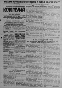 С л а в а н а ш м м д о б л е с т н ы м в о и н а м ! Пролетарии всехстран соединяйтесь! КОММУН Орган Базабкнского райкома ВКП(б) я райсовета деаугатов трудящихся КовосибкрскоЯ области № 12 3 февраля 1343 г., Среда ВСЕ ДЛЯ ФРОНТА! НЕКА 15коп. V 0 награждении почетной грамотой райкома ВКП(б) и райсовета депутатов трудящихся Постановление бюро Бзрабинского райиома В К П (б ) и исполкома райсовета д епутатов трудящихся Наградить почетной грамотой райкома ВКП(б) и райсовета за образце вуюорганизацию уборки и поставок хлеба государству, за заботу о мо щи Красной Армии и братскую помощь героическим ленинградцам: 1. Б е к а р е в а Г. М. — председатели колхоза „Храбрый партизан" 2. Ва си л ье ва О. Н. — председателя колхоза .Большевик” . 3 Абельдинова Р . — колхозника артели ,Кзы л т у “ 4. Зеленского Н. В. — председателя Зюзинского сельсовета Секретарь Барабинского рай кома В К П (б ) И. ГО Р Я Ч Е В . Обоз с подарками городу— воину СЕЛО ЗЮ ЗЯ , 1 ф е вр ал я (по те л еф о н у). Сегодня в Бара- бинск направлен красный обоз из 25 подвод, на нота ры х колхозники Зюзинского сел ьсовета направили свои подарки для героев Ленин града. Колхозники п о сы л аю т 48 пудов хлеба, 92 пуда мяса, 138 пудов ры бы , 85 н у р и гусей, 100 пудов кар тоф еля, 61,5 килограмма шерсти, 176 литров замороженного моло ка, 68 килограммов л у к у , 26 овчин, 3 пары новых пимов, 1 полуш убок. —Город—герой, прими по дарки сибиряков - колхозни ков! Сбор продовольствия и по дарков бойцам и Ленинграду продолжается. Н. ЗЕЛЕНСКИЙ . Председатель Зюзинского сел ьсо ве та . Покупают самолет Воодушевленные бесстрашным ге роизмом и мужеством доблестные зоинов Ленинградского фронта и, же лая помочь им в быстрейшем раз громе врага, члены колхоза „Новая жизнь", Устьянцевского сельсовета, вносят на покупку своего самоле та 90 тысяч рублей. Председатель исполкома рай- Н. ЛАНЙХИДНИКОВ. совета Фсска погата За первенство в сорев новании в честь 25 годов щины Красной Армии , за братскую помощь герои чееким ленинградцам, райком В КП (б ) и райис полком заносят на Дос ку Почета Колхо з „Н о в а я ж и з н ь " (председатель колхоза тов В о лынский) Колхозники этой арте ли решили купить самолет и пере дать его героическим соколам Ле нинградского фронта. Для этой це ли они внесли 90 тысяч рублей. Передовики колхозники ЧУРСИНА Н , РЯЗГОНЯЕВ М. МИШИНА П. * Другие. СЛАВА ИМ! На колхозном собрании, посвя щенном неделе помощи Ленинград ским рабочим, колхозники заявили: — Отдадим все свои силы, все до стояние на разгром врага. Сделаем все, чтобы изгнать его с нашей свя щенной земли. Тут же на собрании 20 тысяч рублей внесла жена красноармейца Чурсина Н., ее примеру последовал инвалид отечественной войны Раз гоняев-М. Д , внесший 20 тысяч рублей, 7 1 ысяч внесла жена крас ноармейца Мишина И С По 5 ты сяч каждая внесли жены красноар мейцев Чурсина П Т, и Чурсина Я. В., 9 тысяч рублей внес со своим сыном и дочерью Самородин П R. Л. ПЕНЬКОВ. Ленинградцам Член колхоза „Яиа - Турмыщ" Нйтерханов Н. в фонд помощи ле нинградцам вносит 1500 рублей де нег, его жена Яйтерханова Сальда^- 500 рублей. Патриоты Лйтсрхановы призывают всех колхозников Н Курупкаевского сельсовета следовать нх примеру. П. ЕГОРОВ. Ответим на спасибо фронтовиков новыми подарками! ПИСЬМО С ФРОНТА Дорогие товарищи! Бойцы и командиры части, которой ко мандует майор Никольский пе редают вам, трудящимся Бара- бинского района сер