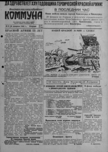 •ДРАВСТвУЕТXXVГОДОВЩИНАГЕРОИЧЕСКОЙ КРАСНОЙАРМИИ! Пролетарии всехстран, соединяйтесь! КИШ И Орган Бавабинского райкома ВКП(б) к райсовета депутатов трудящихсяНовосибрскойобласти №21 23 февраля 1943 г., Вторник [LitНА 15коп. В ПОСЛЕДНИМ ЧАС Наши войска заняли города Красноград и Павлоград. 20 февраля на Украине в результате стремительного наступления войска Юго-Западного фронта заняли го род и железнодорожный узел Красноград, город и железнодорожный узел Павлоград. СОВИНФОРМБЮРО. КРАСНОЙ АРМИИ 25 ЛЕТ Сегодня — 25 годовщпна герои ческой Красной Армпп. Сегодня — праздник побед на фронте н в тылу. Весь мир склоняется перед нашей любимой, родной Красной Армией, Верховным Главнокоман дующим товарищем Сталиным. За 25 лет своего существова ния Красная Армия прошла большой путь борьбы. В 1918 году немцы сделали попытку закабалить нашу родь- ну, захватить наши богатства Момент был очень тяжелый. В ответ на ленинский призыв ра бочие городов стали органпзовы вать отряды и посылать их на фронт против немцев. В этой борьбе и начала создаваться Крас ная Армия. Иод Псковом и Нарвой 23 февраля 1918 года Красная Ар мия па голову разбила немецких захватчиков. Этот день стал дпем рождения Красной Армии. Вожди и создатели Красной Армии— Ленин и Сталин— за ботливо растили ее кадры. Они учили, что только сильная, дис циплиннрованная армия способна защищать завоевания революции, честь н независимость нашей ро зданы. Началась гражданская война. В этой войне, длившейся с неболь шими перерывами почти 4 года, молодая Красная Армия, руково димая Лениным и Сталиным, покрыла своп знамена славой. Она разгромила п выбросила из пределов родины внутреннюю контрреволюцию и интервентов, отстояла независимость советской республики. Красная Армия победила по тому, что она была верна и пре дана до конца своему народу и боролась п о д руководством Ленипа и Сталина. В годы мирного строительства товарищ Сталин постоянно сле дил за ростом и развитием Крас ной Армии. Он заботился о по вышении ее боевой выучки, об укреплении воинской дисциплины, о подготовке резервов. Благодаря товарищу Сталину в эти годы выросли и развились такие важ ные рода войск, как артиллерия, авиация, танковые части. Красная Армия стала мощной современной армией. В дни вели кой отечественной войны Красная Армия с честью выдержала су ровую проверку. Зимой 1941 — 1942 годов она разгромила фа шистские войска под Москвой и отбросила их на запад, нанесла им ряд мощных ударов под Рос товом, Тихвином, Тулой, Калу гой и Калининым. Это было первое серьезное по- ражепие, понесенное гитлеровской армией со времени начала второй мировой войны. Летом 1942 года Гитлер вновь погнал свои войска в наступле ние. Немцы хотели глубоким об ходом с востока охватить Моск ву полукольцом, отрезать столи цу СССР от юга и Урала, а за тем ударить по Москве. Два месяца дпем и ночью, в воздухе и на земле шла беспри мерная битва за Сталинград. Из мотав и обескровив врага, Крас ная Армия, выполняя план това рища Сталина, 19 ноября переш ла в наступление и нанесла сок рушительный удар немецким ди визиям. Красная Армия окружи ла под Сталинградом 330 тысяч неприятельских солдат и офице ров, большинство из пнх было уничтожено, свыше 91 тысячи гитлеровцев во главе с 24 гене ралами взято в плен. Красная Армия в этой исторической битве показала всему миру непревзой