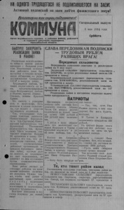 НИ ОДНОГО ТРУДЯЩЕГОСЯ НЕПОДПИСАВШЕГОСЯ НА ЗАЕМ! Активной подпиской на заем добьем фашистского зверя! Орган Бзрабинского горкома, и райнома ВКП(б), р а й с о в е т а и горсовета депутатов трудящихся, > Новосибирской области СЛАВА ПЕРЕДОВИКАМ ПОДПИСКИ — ТРУДОВЫМ РУБЛЕМ РАЗЯЩИХ ВРАГА! Передовые сельсоветы Передовыми сельскими советами в реализации займа на 6 мая идут: Зюзинский сельсовет (председатель сельсовета тов. БОБРОВ), за сутки реализовал новый заем на 130 процентов к плану. Кожевниковский сельсовет (председатель сель совета тов. ХОЖАИНОВА), реализовавший заем на 126 процентов к плану. Устьянцевский сельсовет(председатель сельсове та тов. БЫСТРЕНКО), реализовавший заем на 117 процентов к плану. Реализация займа и погашение подписки налич ными продолжается. П А Т Р И О ТЫ БЫСТРЕЕ ЗАВЕРШИТЬ РЕАЛИЗАЦИЮ ЗАЙМА В РАЙОНЕ! Реализация нового военно го займа в нашем районе проходит с большим успе хом. Намеченный исполко мом райсовета план был выполнен в течение вечера, после об'явления по радио постановления Совнаркома СССР о выпуске займа. Трудящиеся района, ак тивно подписываясь на з а ем, продемонстрировали свою безграничную любовь к Родине, партии Л е н и н а - Сталина, воинам Красной Армии. Но вместе с успехами есть и недостатки. Есть колхозы и целые сельсове ты, где медлят с охватом трудящихся подпиской. Так, отстающими сель скими советами являются: Новогутовский (председа тель тов. Сартаков), Новос пасский (председатель тов. Кравченко), Песчанский (пр ед се да т ел ь тов. Кузне цов). Здесь подписка сос т авляет немногим больше 50 процентов к плану. О б ‘- ясняется это тем, что ру ководители совхозов, к о л хозов, уполномоченные районных организаций не придали серьезного значе ния займу, пустили дело на самотек, не поднимают на щит передовиков, не равняют по ним отстающих путем социалистического соревнования. Наш район отстает от соседних районов по пога шению подписки наличны ми деньгами. Нужно т а к же, чтобы наш район в кратчайший срок погасил п о д п и с к у наличными деньгами. Э т о — долг колхозника и колхозницы, к ажд о го трудяще гося . Быстрее завершим и по гасим подписку на новый заем! Настоящим патриотом показал себя скотник Коз ловского совхоза Абакир Тасов. Он вперед других подписался на новый заем на сумму 1000 рублей и 500 рублей внес наличны ми. й А когда к нему обрати лись его малолетние сы новья Букарден и Туктас с просьбой подписать и их на заем победы, тов. Та- Колхоз им. Андреева. Вскоре после того, как здесь стало известно о выпуске правительством Третьего Государственного Военного Займа, в контору торопли во вошел 70-летний колхо з ник Иван Егорович П е т ров. —Хочу быть впереди по \ сов сказал: — Так, так, дети. Нам Родина дорога, а вам еще дороже. Вы жить будете, молодые. И Туктас и Букарден подписались каждый на 100 рублей. На третьей ферме этого совхоза все рабочие под писались на заем на три месячных оклада. ♦ займу-то — говорит Иван Егорович. Вот, подписывай т е ,—сказал он, доставая из кармана 3000 рублей. —Пусть наши сибиряки хл ещ е громят немцев! Так исполнил свой долг п еред Родиной старый кол хозник Иван Егорович П е т ров. Те, кто тянет район назад Отстающими сельскими советами, тянущими район на зад по подписке на новый з а ем ,н а 6 мая являются: НОВОГУТОВСКИИ СЕЛЬСОВЕТ (председатель сельсовета тов. Сартаков, секретарь парторганизаци