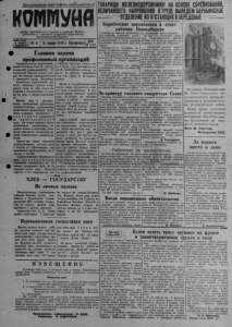 Пролетарии всех стран, сойЪшвгйтесь! КОММУН Орган Барабинского горкома и райкома ВКЩб), райсовета и горсовета депутатов трудящихся, Новосибирской области Гмата выш ит I » четпргаи I jjjjjw iu a я № 5 14 января 1945 г- Воскресенье ЦЕНА 20 к о п ТОВАРИЩИ ЖЕЛЕЗНОДОРОЖНИКИ! НА ОСНОВЕ СОРЕВНОВАНИЯ, ВЕЛИЧАИШЕГО НАПРЯЖЕНИЯ ВТРУДЕ ВЫВЕДЕМ БАРАБИНСНОЕ — — ОТДЕЛЕНИЕ ИЗОТСТАЮЩИХ ВПЕРЕДОВЫЕ— = — Барабинские паровозники в ответ рабочим Новосибирска Отвечая на призыв новосибир Главная задача профсоюзных организаций Социалистическое соревнование, новый производственной под‘«м, вызванный ириблвжагощейся 27 гедовщаноЗ КрасчоЗ Армии, охва тил все отрасли промышленности в транспорта города Барапвнск. Коллективы предприятий, ра бочие, инженеры, техники н слу жащие взяли на себя новые по вышенные обязательства, не мед ля нн дня, с честью выполняют их. Велика роль в ра;верты ванвя, повседневном руководстве социалистически» соревнованием профсоюзных организаций. Проф союзы призваны возглавлять и . п о д н и м а т ь трудящихся 'на с а м о о т в е р ж е н н ы й труд. На основе массовое социа листического соревнования, пе редача опыта передовиков отста »щим добиваться повышения де ловой квалификации каждым ра бочим Однако мы имеем некоторые профорганизации, которые стоят в стороне от соревнования или занимаются соревнованием, но от случая к елучаю Профорганизация Барабивск<'го депо, п р и з в а н н а я ор ганизовать паровозников на ус пешное преодоление зимы, не по называет своего лица. Местный комитет а его председатель тов. Сгефнчцов всю свою работу све ли к тому, ч ■ о занимаются вы- промтоварных ордеров, ор деров на топливо, занимаются в:ем чем угодно, на не соревно ванием. Забота об удовлетворении нужд членов союза, трудящихся— важ ное дело я необходимое. И пра вплтво делает местный комитет депо. Но нельзя же забывать главного в раб >те — воспитания масс в духе сознательных тру жеников нашей Родины, .моби лизацию масс на помощь фрон ту, на достижение скорейшей победы. Задача каждой ороф «рганиза зии— возглавить социалистичес кое соревнование, добиваться то го, чтобы предприятия или уч реждения из) дня в день, из месяца в месяц раб 'Тали nj гра фику. выполняли бы произродсг венные планы. Чесаные комите ты обязаны повседневно прове рять вы олнение взятых обиза тельств трудящимися, организо вать глаеноегь соревнования— доски почета, показателей, вы пуск стенгазет я боевых листков. Организация массового дейст венного социалистического сорев нования— главное сейчас в рабо те профоргвнизаций. ских рабочих, передовые маши нисты депо Барабинск включились в соревнование в честь славной годовщины героической Красной Армии. ч I Машинисты тт. Голенков, Де мидов, Кудрявцев, Ковалев и дру- I гие взяли обязательства: — Перевыполнять техническую скорость на 2 километра в час; — Ускорить оборот паровоза на 5 часов; — Водить'паровоз на кольцо и экономить топливо не менее 10 процентов. Свое слово они сдерживают. Ha-днях машинист тов. Ковалев и его бригада, на перекор ж гу чим морозам, из Татарской в Б а рабинск доставила порожняковый состав, среднесуточная скорость доставила 1078километров. Брига- сэкономила много топлива. На имя ю в. Ковалева секре тарь Новосибирского обкома В К П (б ) т)в. Кулагин прислал те леграмму, в которой говорится: — Областной комитет партии отмечает вашу хор