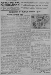 но воле нс кий колхозник Орган Доволенского райкома В КП (б ) и районного Совета депутатов трудящихся Новосибирской области ' № 8 (958)- 23 февраля 1947 . Воскресенье Цена 15 ко т Да здравствует героическая Советская Армия1 Да здравствуют славные советские воины, с честью выполнившие свой долг в Великой Отечественной войне, бдительно охраняющие созидательный труд советского народа! Да здрсатввеут 29-я годовщина Советской Аруи! ИЕШ ЯЖ С Праздник Советской Армии 29-ю годов- . Сегодня наш народ празднует щи ну Советской» Армии. Советская Армия—детище Великой Октябрьской социалистической революции. Она была воздана Лениным и Сталиным в огне гражданской войны и за минувшие годы прошла путь славных побед. В войне 1918—1920 годов Советская Армия иод руководством большевиков отстояла великие революционные завоевания парода. Она наголову разбила вражеские полчища, стремившиеся восстановить в стране власть капиталистов и помещиков. Разгром интервентов и белогвардейцев обеспечил на.иему народу длительный мир. Код руководством партии Ленина—Сталина советский народ восстановил народное хозяйство, а затем, в годы сталинских пятилеток; осуществил социалистическую индустриализацию .страны и коллективизацию сельского хозяй- ч ства. Из отсталой и слабой наша страна превратилась в мощную индустриально-колхозную, социалистическую державу. Все эти годы Советская Армия твердо стояла на стране социалистического строительства, а народ всемерно укреплял своп вооружённые СИЛЫ. против честыо на неё герой- неред Л Великой Отечественной войне фашистских захватчиков наша армия с оправдала надежды, которые возлагал народ. Один на один она несколько лет скн сражалась с гитлеровскими ордами, которыми не устояла до того времени ни одна армия на Европейском континенте. Она выдержала бешеный натиск вражеских сил. Под руководством нашего гениального полководца Генералиссимуса Советского Союза товарища Сталина иалга армия разбила врага, очистила от оккупантов в<-е советские земли, принесла освобо кдение народам Европы, водрузила знамя победы над Берлином. Советские вооружённые силы одержали блестящую победу и над империалистической Японией. Благодаря тому, что наш народ за годы пятилеток построил мощную промышленность п создал колхозы, Советская Армия получала в военное время вдоволь самолётов, танков, артиллерийского и другого воору .¿ения, боеприпасов, обмундирования, продовольствия. Организованный и сплочённый боль левнстской партией, весь народ еаиоотвер кенно трудился, поддерживая свою любимую армию-защитницу, Советская Армия—это армия трудящихся масс. Товарищ Сталин говорит, что сила наше! армян в том, что у нас «народ н армия составляют одно целое, одну семью. Нигде в мире нет таких любовных и заботливых отношений со стороны народа к армии, как у нас». Другая особенность, другой источник силы на ..ей армии заключается в том, что Оia—армия братства народов нашей страны. Всё её существо зиждется на укреплении уз дру.ибы народов, на идее защиты, свободы и независимости народов Советского Союза. Благодаря этому трудящиеся всех национальностей нашей страны безраздельно доверяют своей армии и поддерживают ее. Третьей особенностью нашей армии является то, что она воспитана в духе уважения к другим народам, в духе сохранения мира между странами. Народ