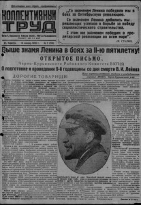 Пролетарии всех стран, соединяйтесь! ИИТНН ТЕМ Орган Ч.-Курьинского Райкома ВКО(б). РИК'а к РаСпрофсовета Выходит 1 раз в 5 дней Ст. Карасук. 10 января 1933 г. № 2 (218) „Со знаменем Ленина победили мы в боях за Октябрьскую революцию. Со знаменем Ленина добились мы . решающих успехов в борьбе за победу социалистического строительства. С этим же знаменем победим в пролетарской революции во всем мире". (И. СТАЛИН). "ыше знамя Ленина в боях за П-к> пятилетку! * ОТКРЫТОЕ ПИСЬМО, Черно-Курьинского Районного Комитета ВКП(б) 0 подготовке и проведении 9-й годовщины со дня смерти В. И. Ленина Всем партколлективам, ячейкам и кандидатским Девятая годовщина со дня i смерти В. И, Ленина—велико i го вождя пролетариата и ком i мунистической партии совпа i дает с успешным завершением i в Четыре года первой пятилет киу началом второй пятилет-1 -пятилетки построения бес । ^^ссового социалистического Ящества. \ Всемирно-исторические по жды з области социалистиче схого строительства, с кото рыми партия приходит к девя той годовщине смерти В И Ленина, достигнуты только благодаря тому, что партия и ее Ленинский ЦК во главе чет Сталиным следуя заветам Ленина, в непримиримой борь ф со всеми разновидностями оппортунизма, борясь на два фронта—против правого укло на, как главной опасности на данном этапе, а также против контрреволюционного троцкиз ма, гнилого либерализма и примиренчества к уклонам от Ленинизма—сумела мобилизо ^Гать творческую инициативу рабочего класса и трудового крестьянства на выполнение грандиознейших задач соци алистаческой стройки. Пущены в ход величайшие в мире гиганты: Кузнецкий металлургический завод, Дне провская гидростанция. Сотни , новых фабрик, заводов и элек ростанций вступили в строй ^действующих гигантов социалистической индустрии. 14,5 млн—60 7 проц, бедняцко середняцких (ранее разрозненных) крестьянских хозяйств твердо встали на путь колхозного строительства Под сельское хозяйство подведена прочная механическая база. 5820 совхозов, 2498 МТС. 21100Q колхозов, 147000 тракторов, 10300 автомобилей, 11700 комбайнов и 136,3 милли онов га посева в 1932 году— таковы цифры по основным показателям большевистских побед. Решена самая важная, са мая трудная задача пролетар с»ой революции. Советский со из страны мелкого и мельчайшего земледелия превратил ся в страну самого крупного в мире земледелия на основе коллективизации, развертывания совхозов и широкого при менения машинной техники» (Из решен 17 конф. ВКП(б) Пятилетний план строительства совхозов. MIC и колхозов пере выполнен. Б 1933 году-первом году вто рой пятилетки партия призывает к значительно большему, по сравнению с предыдущими годами, движению вперед, по пути еще большего развита" всего 1 дальнейшего укрепления обо роноспособности страны строю щегося социализма. По прежнему в центре вни мания стоят задачи развитая крупной индустрии, этектри фикации и социалистической реконструкции сельского хозяйства на основе организационно-хозяйственного укрепле ния колхозов и совхозов, еще большего укрепления механи ческой базы сельсквго хозяй ства и развития товарооборо та в стране на основе развер тывания советско - колхозной торговли. В условиях нащего района Ленинские дни нынешнего 1933 года должны пройти под знаком всемерной борьбы за улучшение качества 'работы всех партийных, советских комсомольских, про