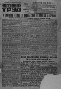 Пролетарий всех стран, соединяйтесь! ■ Орган Карасунокого РайкомВаКП<б) и Райисполкома Западно Сибирского края Выхоидт1 разв5-днеі ^ Ст. КарІсук' 14феврлая35г. № 8 (351) ПЛЕНУМ ЦК ВКП(б) / Февраля 1935 года состоялся Пленум ЦК ВКП(б). и ѵ с * п а 1ЛенѴМ яостановал ввести в состав Политбюро ЦК ВКПІо) тт М и и п а и » .. Ч У ВАРЯ, а в состав кандидатов в члены Политбюро тт Ж Д А Н О В А а Э Й Х Е ° ЯЫХ 2) Пленум постановил ввести в состав Секретариата ЦК ВНП(б) т. ЕЖОВА ѵ ч л постановил поручать т. Молотову войта от имени ЦК вкп/гл в) ^ ™ ь* ейшей демократизации избирательной системы в смысле замены не закрытым ^ вЫб° Р° в р а з т ' ^огост .пенных-прямыма открытыл Уточнения социально-экономической основы конституция в смысле „ „ „ „ „ дения конституции в соответствии с нынешним соотношением ‘классовых сил в СССР (создание новой социалистической индустрии, разгром козаче ства. победа колхозного строя, утверждение социалистической собствен н о ш и как основы советского общества н т. п.) и‘аяли' ти‘іескоя в бюро Крайкома и президиум Крайисполкома отмечают, что пер воиачальио установленные сроки засыпки семенных фондов боль віенством райнов невынолнены и сортообменные операции прово двтса безобразно медленно. Эго я см вл о я т е р т я ся на сл в е с д ю ств о и ч е е м вид т н ог о о ст , ь чт п о ер н в е о степенного значения создания доб рокачественных семфондов, райко мы и райисполкомы не засыпав ших семян районов не поняли р сы ешпк а иющ с е е г м о ян зна и чен с и в я оев п р о е л м н е о н й но з г а о проведения сортообменных опера цнй для успеха посевной н под'е ма урожайности, Эги райкомы и райисполкомы несумели политике ски н организационно использо вать в интересах форсирования засыпки семфондов ту огромную помощь, которая оказана ироде тарским государством колхозам ЗаиадноЙ Сибири в виде семей н л н о и а й о п н р с а с о у д п д о у ы в д о о л в в ь к с и т о в л р е и а н з ч н р е о е стш го в е е ни з 6 я е , р 5 о н б а м м и н е л а т в о ы в с о о е ко в ка к ч о е л с и т ч в е е с н т н в о е е, 3 т , о 5 в м ар и н л о л - и с о о н р а пудов. Преступная бездеятель мость н отсталость, допущенные этими райкомами и раиисполко нм а е мн ины в х к ф а о м н п д а о н в и , и яв п л о яе з т а с с я ылк сл е ед се ст внем фактического отказа с их стороны от руководства колхоза ми н их отрыва от живой рабо ты по засылке семян, что сочесае тся в отдельных звеньях совет ских и партийных ацпаратов с величайшей безответственностью п го а то эт в о к ми в к ажпо н с е е й в шн е о мй к у а ч м а п с а т н к и е и п . од А эта практика самотека развязы вает руки классово-враждебным, вредительским элемешам, пытаю щимся путем всяческих ухищре ний подорвать' успехи предстоя щей посевной кампании. Засыпка и подготовка семян к •есне в.данный момент — осірей шнй участок классовой борьбы. Классовый враг всячески подог р хо е з в н ае и г ко с в ред и и жд о е т в ст е а н л ч ыес х к с и л е о , ев ме к л о к л о буржуазные, собственнические на с с т т а р л о ыен е ия г , ру т п ол п к ы ает кол от хо д з е н л и ьн к ыов « о н т а чуть рваческих попыток взять все лучшее себе для распределения, а колхозу на семена оставить зерно негодного качества. Каза лось бы, что в этих условиях райкомы и райисполкомы додж н ц ыион б ны у л юи б мди о т б е и л л ь и н з о о с в т а ь ть кол р х е о в з о н л ыю х масс для успешного разоблачения аытиколхозных, иждивенческих настроен