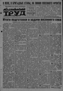 г 2 . КОЛЛЕКТИВНЫЙ ТРУД СТАЛИНСКИЙ ПРОИЗВОДСТВЕННЫЙ поход ЗА УРОЖАИ НЕ МЕНЕЕ 15 ЦЕНТНЕРОВ С ГЕКТАРА! д о м н а л у г о в а я в ы з в а л а ОТВЕТ ТКАЛЕНШОЙ ВЕРЫ НА СОРЕВНОВАНИЕ ТКАЛЕНК08У ВЕРУ и1ШЛ Утром 2 апреля Луговая Домна и Хатюшмна Мария снова посетили свиноводческую ферму колхоза «Но вый труд», Положение в свинарниках заметно улуч шилось: крыши очищены от снега, исправляются идет ки, председатель колхоза тов. Угрюмое отдал распо ряжение починить окна. В первом бвйпараике нет той уже грязи, которая вче ра еще здесь была. Вечером Луговая Домна написала следующее письмо делегатке Ш Краевого с‘ез да колхозников-ударников Тяаяенковой Вара—колхозяи це из «Веселого труда». Дорогая Вера Захаровна! Мы вместе с тобой были на двух с‘ездах колхозников ударников: на краевом и районном. Наша Западно- Сибирская делегация на VO -m Всесоюзном (/езде Со ветов внесла предложение об органг&ации Сгалинско го похода за высокий уро жай и за развитие живот иоводства. Колхозники всей нашей 'необ'ятной страны горячо откликнулись на этот призыв. Сталинский поход принес уже огромные положительные резуль таты и я хочу поделиться с тобой опытом своей ра боты, а ты напишешь мне о Ста#нском походе, как он организован и проводится у Вас. Я начала работу так: наши предложения быстро выступила на собрании выполняет, колхозного актива и пред Одновременно с эгим мы дожила правлению колхоза ведем большую обществен- помрчь мне организовать но-массовую работу, которая в колхозе Сталинский по- сейчас же приносит ход Правление охотно пош ло мне навстречу, в помощь мне сейчас же были выде лены: Хатюша Мария—лущая ударница и Моисеенко Петр— лучший колхозный конюх. С этого времени мы про водим ежедневно работу по Сталинскому походу На 2 апреля мы проверили храпе ние семян, уход за телята ми, содежание крупного скота, овец, проверили свиноферму, культурные ста ны, содержание лошадей, сбрую, оранизацию труда в бригадах и т. д. Надо сказать, что наш колхоз «Новый трудс аепло хой, но тем не менее иедо ста тков в хозяйстве еще много. После каждого обспедова ния мы идем в правление колхоза и требуем сейчас же устранить замеченные не порядки. По нашему пред ложен ию правлением заме йены сторожа, охранявшие семена, очищены свинарни ки, улучшен уход за молод няком скота Мы нас гаи наем немедленно оборудовать культурные станы и сейчас же правильно рассга вить рабочие руки в брига дах. Правление колхоза tee ■■Г"— — нам пользу. В результате стали некого похода доярки м по ярки об*'яв»4И себя ударни цами й уже соревнуются одна с другой; вышло два номера стенгазеты, посвящен Нон сталинскому походу; все комсомольцы включились в сталинский поход и об" явили .себя ударниками. Вот я и решила поделиться с тобой опытом 9Jой работы, зная, что ты лучшая ударви ца в «Веселом труде,» недав яо вступила в комсомол, бы ла на двух с'ездах, работаешь в телятнике и кому, как ни тебе, проводить большую работу в колхозе за развитие животноводства, за высокий урожгй. В вызваю тебя, Вера, на соревнование по Сталинско му походу. Если ты соглас на, напиши мне и мы заклю чим с тобой социалистичес кий договбр. Еще собщаю, что мы дерем ся в своем колхозе не ниже чем за 15 цен. урожая с тек тара и обязались не допу стигь ни од того случая паде жа скота. Жду ответ. С приветом -ДОМНА ЛУГОВАЯ, 2 апреля 1935 г. .Новый Труд• Дорогая Даша Яковл