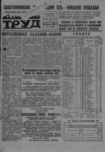 Пролетарии всех стран ч £J\ — 1 ‘ V : ^ <• 50 •КИМ СЕВ,—НИКАКОЙ ПОЩАДЫ! лЦ й , Орган Карасукского Райкома ВКП(<5) и Райисполкома Зап—Сиб. края Выходит 1 раз в 5 дней Ст. Кзрагук 28 яярш 1935 г. Ко 21 (364) ПЯТИДНЕВНОЕ ЗАДАНИЕ-ЗАКОН В севе прорыв. Пятидневное задание на 25 апреля большинством колхозов сорвано. Колхозы, вы полнившие задание на сто и боль ше процентов, составляют крайне небольшую группу. Таких колхо зов только четырнадцать. Но сам по себе факт успешного вы полнеиия пятидневных заданий этиш^ колхозами является разя uiffiflpiapoM по всем .шляпам", оппортунистам и саботажникам, где бы они ни сидели, какой бы пост не занимали и сколько бы они ни старались оправдываться и оправдав срыв пятидневных заданий. Подливные большевики познаются на опыте борьбы за линию партии, за успешное решение «оставленных ею задач. Здесь же, в ходе этой борьбы выявляется все негодное, оппортунисты и прямые саботажники, протовопо сгавляадщне липни партии свою (а, по сути дета, кулацкую)линию. И ни чем иным, как только наличием большого количества послед ней категории людей, засевших на различных участках фронта весеннего сева, об'ясняется иро вал пятидневных заданий по кус ту Хорошенской МТС н ряду дру гих колхозов. Здесь, в ряде колхозов Хорошенской МТС кулацкий саботаж пдавил срою особую живучесть и наглость саботажников достиг ла высшего предела. В то же время директор МТС тов. Со ловьев и зам. директора по политчасти тов. Коврвгйн не проя вили надлежащей классовой бди тгльности, не заняли твердой большевистской линии, не обру шились со всей силой на саботажников, а доиустилн несвой ственный большевикам либера ралнзм, примиренчество. Райком партии и Райисполком в своем специальном решении .о ходе сева в колхозах Хоро шенской МТС*, принятом 26-го апреля, сделали все необходимые политические и органнзацнон нме выводы, направленные к тому, чтобы в корне изменить поло женне в колхозах Хорошевской МТС и йнквиднровать прорыв, допущенный ио этой MTG в вы полненин плана сева. 7ХЗа кулацкий саботаж сева, срыв пятидневного задания ио посеву сняты с работы и привле чены к судебной ответственности , председатели колхозов .Дружный | труд* — Терентьев, .Путь бе, ' ноты"—Горбов, им. Андреева— Л Цк’маченко. \]у Одновременно РК ВЛКСМ исключил из комсомола агротех ника Воробьева, который разез жал по колхозам (.Безбожник*! и др.), ориентировал руководите' лей колхозов на удлинение сро-‘ ков сева с 18 дней до 23, игмо рнровая данные колхозам задания ио пятидневкам и установленные предельные сроки окончания сева. Вместе с тем, Райком и Райис полком предложили дирекции МТС снять Воробьева с работы н отдать под суд. < Подтверждена правильность сня тия с работы и отдачи под суд бригадира колхоза „НовыйДуть,— Михайленко за- саботаж сева и ррыв пятидневного задания. Предложено дирекции МТС не медленно снять с работы тракто риста Ковригу Михаила (кол хоз .Дружный труд") и бригади ра Бондаря (колхоза нм. Андре ева), как классово-чуждых эле менгов. Райком партии и Райисполком, изложив взыскания на! ряд других работников, в том числе и уполномоченных Райкома н Райисполкома, поставили перед ними задачу ликвидировать образовавший ся прорыв в севе. Выводы Райкома партии и Райисполкома, их указания ка ошибки дирекции МТС и требования, пред явленные как работникам самой МГС, так и вгем руководителям колхозо