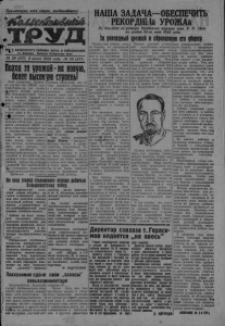 Пролетарии всех стран, соединяйтесь1 Т Р У Д у o p t Ч КАРАСУКСКОГО РАЙКОМА ВКП(6) И РАЙИСПОЛКОМА г Сг. Карасук, Запаяно Сибирского края М 28 (371) 8 июня 1935 года М 28 (371) Поши урожай-н новую, болеевысокуюступень! Речь с кретаря^ Крайкома партии тов. ЭЙХЕ, произнесенная им по радио, является боевой програм мой большевистской борь бы за высокий урожай на f новых, самых ответственн ы х , самых решающих эта- 1▼пах сталинского иахода. В свете тех указаний, ко I^ торые даны и тех требова- ■/ НШ\ которые пред'явлены орденосным руководителем западно-сибирских больше виков товарищем ЭЙХЕ ко все;м сельским коммунистам и беспартийным работникам, призванным решать задачи на социалистических полях, надо сейчас же, сегодня проанализировать всю работу, вы травить малейший 'налет оппортунистического благодушия и ротозейства, на метить четкую перспективу работы, предусмотреть до „мелочей* все необходимое ^яя успешного проведения уборочной и хлебопоставок. Добиться рекордного урожая, образцово, без по терь провести уборочную и с честью справиться с задачами хлебопоставок можно лишь при условии неослабного ухода за посе вами, очистки их от сорняков, уничтожения полевых вредителей и приведения в боевую готовность всех машин, всего сельскохозяй ственного инвентаря и всех живых сил, призванных ре шат задачи. Особое внимание должно быть уделено вопросу подготовки кадров, ибо „кадры решают вса“ (Сталин) Наш район, хранящий Орден Ленина — высокую награду партии и правительства, полученную Западно-Сибирским краем, может "и должен в ответ на речь товарища Э/iXE поднять на более высокую ступень всю свою работу и более ярко, чем когда- бы то ни было, показать образцы подлинной большевистской работы. НАША ЗАДАЧА—ОБЕСПЕЧИТЬ РЕКОРДНЫЙ УРОЖАЙ Из доклада секретаря Крайкома партии тов. Р. И. Эйхе по радио 31-го мая 1935 года За реокрдныуройжай и обрзацовуюегоуборку Навсех этапахсталинского похода добиться больешвисткхипобед Лепокуровский сель- , грабли, вилы веревки ский совет обсудил на своем пленарном заседа нии при участии актива колхозов задачи подготовки и проведения се но-хлебоуборочной кам- паниии хлебопоставок. Сейчас во всех четыр е х колхозах Лепоку- ' ровского сельсовета раз вернута широкая массо- вая-политическая и организационная работа вокруг поставленных за дач Тпециально созданные комиссии проверяют го ровность к работе сено косилок, конных граблей, лобогреек, мешко-тары, ящиков для перевозки зерна, молотилок, амбаров, особо обращая внимание на так называв мые „мелочи"—ручные и т. д. Колхозы преобре тают горючее для авто машин. На полях колхозов воздвигаются сторожевые вышки для дозорных, охраняющих урожай от потрав и прочих злодеяний враждеб ных колхозному строю элементов. Колхозники воодушев лены стремлением добиться на новых этапах сталинского похода бо лее лучших побед, чем это было в посевную. Лепокуровцы постави ли себе з&фчу в 7-8 дней выполни vb в этом году свои обязательства по поставке хлеба госу дарству, Ф. МАРЧЕНКО Колхозники сдачи свои „запасы" сельхозинвентаря Сельхозартель „Красный хутор*, Ирбизинского сель совета значительно подкре пила себя инвентарем за счет необобществленого i свое время инвентаря и от дельных частей к машинам, хронившихся и просто валя BuijjffccH по дворам колхозни кое направах „частной соб ственности* После того, как 
