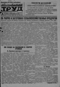 ПИ Пролетарии всех стран, соединяйтесьI 1РГАН КАРАСУКСКОГО РАЙКОМА ВКП(б) И РАЙИСПОЛКОМА ДП Ст, Карасук, Западно-Сибирского края № 29 (373) 13 июня 1935 года М 29 (373) П Л Е Н У М Ц К В К П ( б ) ИНФОРМАЦИОННОЕ СООБЩЕНИЕ 5—7 июня 1935 года состоялся пленум ЦК ВКП(б) Пленум рассмотрел два вопроса'. 1) об уборке и заготовках сельско-хозяйственных продуктов и 2) о служебном аппарате секретариата ЦИК Союза ССР и тов. А. Енукидзе. Соответствующие резолюции пленума ЦК ВКП(б) приводятся, ниже. ОБУБОРКЕИЗАГОТОВКАХСЕЛЬСКОХОЗЯЙСТВЕННЫХПРОДУКТОВ Резолюция пленума ЦК ВКП(б) по докладам т.т. Чернова, Калмановича и Клейнера, принятая 7 июня 1935 г. Результаты весенних сель скохозяйственных работ 1935 года с особой яркостью подтверждают успехи кол- хСЙшого строя. Сокращенные сроки и лучшее, но сравнению со всеми прошлы годами, качество сева в [^колхозах и совхозах созда L ли все возможности полу- k чить хороший урожай. * З^шзепление успехов весен нЯР сева требует неослабной борьбы партийных и советских организаций,кол хозов и совхозов за сбор высокого урожая путем свое временной прополки посе вов для ликвидации сорняков, уничтожения сельскохозяйственных вредителей и организации уборки без потерь и в кратчайшие сро ки. Для обеспечения образцовой уборки урожая текуще го хода Розданы все необхо димые условия. Колхозы И совхозы к уборочной кампа нни получают дополнитель но к тому, что они Имели в уборочную кампании про шлого года: 21 тысячу ком байнов, 99 тысяч тракторов, в том числе 17 тысяч мощных «.Сталинцев», 30 тысяч автомобилей и на 335 миллионов рублей остальных сельскохозяйственных машин. Созданы благоприятные условия для закрепления кадров 1трактористов и машинистов ' на молотилках и комбайне' ров в МТС и совхозах и для повышения их заинтересованности в лучшей работе по уборке. Однако, все эти условия еще не гарантируют полно го успеха уборочной кампании. Успех уборки решит систематическое и повседневное руководство партий ных организаций уборкой, вовлечение всей массы кол хозников и рабочих совхозов в активную работу по уборке и использование полностью всех машин и особенно комбайнов. Еще более серьезное зна чение имеют обеспечение сохранности убранного уро жая, охрана его от расхи щения, честное выполнение в срок планов заготовок и обеспечение семенных фондов хорошего качества. Решительная борьба с раз базариванием и расхище нием убранного хлеба пред ставляющего общественную социалисти ческую собствен ность, ликвидация пережит ков кулацко-рваческих на строений, направленных к подр'ыву заготовок и ослаб лению их темпов, мобилиза ция колхозных масс и совхозных рабочих в этом деле—таковы средства, обес печивающие выполнение планов заготовок и образо ванне семеных фондов. Пленум ЦК ВКП(б) ПОСТА НОВЛЯЕТ: ОБ УХОДЕ ЗА ПОСЕВАМИ И УБОРКЕ УРОЖАЯ А. Зерновые культуры и подсолнух 1. Обязать все партийные организации как район ные, так и областные давать решительный отпор вредным настроениям сре ди части работников, выра жающимся в том, что пос ле хорошо проведенных предпосевных работ, сор няки стали будто бы не опасны и закончить в крат чайший срок прополку всех зерновых культур вплоть до полного уничтожения сорняков на посевах. Провести до начала уборки хлебов двухкратной», а в случае нового появления сорняков и мйо- гократную междурядную обработку подсолнуха и кук