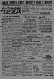 Пролетарии всех стран, соединяйтесь! Орган Карасукского Райкома ВКП(б) и Райисполкома* Заи. Сиб. края Выхиодт 1 разв5 дней Ст. Кэрасук 16 ИЮЛЯ 1935 1 № 34 (378) „Убрать урожай быстро и без потерь, досрочно высококачественным зерном выполнить свои обязательства перед государством по хлебосдаче—это наща 4главная задача (Из обращения первого краевого елета колхозниц-вязальщиц) БЫТЬ ГОТОВЫМИ! Убрать урожай быстро и бее потерь, досрочно высоко качественным верном выпол niiYig свои обязательства перед государством по хлебе - сдаче—-это нвша главная ^задача" (из обращения крае вого слета)» №решению этой ответст венной и первоочеред- задачи к(ы должны уже взвы ть готовыми. Колхозы Кукаринского сельсовета 15-го июля приступили к косовице овса. Дня через- три, четыре приступят к уборке хлебрв колхозы шнлово-курьинского сель совеТа „1-е мая“ „Вперед к коммунизму» и многие дру гие колхозы. Ноне смотря на это многие звенья подготовки куборочной и зеодо поставкам, остаются/1«се "еще не разрешенными. Мы имеем очень много фактов, когда многие руко водители колхозов и сель ских советов надеются на самотек, недооценивают / трудностей предстоящей уборки, не мобилизуют себя на борьбу с ними. Пленум ЦК ВКП(б) по требовал быть готовыми убирать и молотить хлеб в любые условия погоды. Однако строительство кры тых токов поставлено под угрозу срыва. Многие руко водители колхозов, как например «Память Ильиче, пол тавского сельсовета-Гри- шин, «Путь бедноты» Завод цов идр. преступно игнори руют строительство токов. Во многих колхозах строи тельство токов развертывается недопустимо медлен но. Такое положение со строительством токов тер пимо быть не может. Надо по такой самоуспокоенно- . сти нанести беспощядный сокрушительный отпор, ь Со строительством зерно • хранилищ, амбаров, с ди зинфекцией их, с подготов кой транспорта для выбор ски зерна на элеватор вы глядывает дело далеко не блестяще.Такие колхозыкак им.; Петровского (председа тель Сайко) „Красный пере коп“ (пред. Зубарев) до настоящего времени не при ступили к оборудованию амбаров. Полностью не закончен ремонт* лобогреек н молотилок („Союз бедноты" и другие). Имеются и такие колхо Зы, как „Красный перекоп„ ^Красный партизан", кото до настоящего време ни не закончили прополку зерновых и технических культур. Вязка хлебов в снопы о 'д н о из решающих средств “борьбы с потерями. Однако дело с подготовкой к этому важнейшему мероприятию во многих местах продолжает оставаться далеко не удовлетворитель ной. Чтобы успешно выпол нить эту задачу, надо быть готовыми. .Сейчас надо немедля ни одного дня прис тупить к заготовке переве сел, к организации звеньев вязальщиц, к выделению участков, где будет произво диться первая вязка снопов. Со.стаявшийся краевой слет колхозниц-вязальщиц поставил перед колхозами и всей советской обществен ностью ряд боевых не отлож ных задач. В частности след *в сёоем обращении потребовал*1провести до 25 июля взаимную проверку го товнооти к уборка и хлебе сдаче между соревнующими ея колхоаами. районами и сов хо8ами.Проварку надо сделать >о пристрастием, чтобы ни одна недоделка и из“ян в работе на остались необнару женными. Такая взаимная про верка даот большой толчок « лодгот явке к уборке н хлебо сдаче". Это требование дол жно быть выполнено во что бы то ни стало, Взаимная проверка готов ност