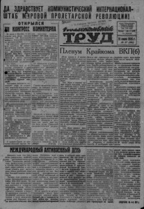 ДА ЗДРАВСТВУЕТ КОММУНИСТИЧЕСКИЙ ИНТЕРНАЦИОНАЛШТАБ НОРОВОЙ ПРОЛЕТАРСКОЙ РЕВОЛЮЦИИ! О Т К РЫ Л С Я Ш КОНГРЕСС КОПИМ 25 июля В Москве, в колонном зале Дома союзов открылся VII Всемирный монг.ресс Коммунистическо го интернационала. На конгрессе присутствуют делегаты 65 коммунистических партий мира. Среди делегатов—товарищи; Димитров, Кашен, Марти, Ван-Мин, Торез, Ленский, Поллит, Пик, Ърколи и много других ^звестныХ борцов за дело освобождения трудящихся всего мира. За четверть часа до открытия конгресса в зале появляется товарищ СТА- « Н. Вес\ зал встает риветствует любимо го вождя мирового пролетариата товарища СТАЛИНА бурной овацией. Заседание конгресса открывает один из старейших деятелей международного рабочего движения и руководителей германской компартии товарищ Вильгельм Пик. Встреченный аплодисментами, товарищ Пик произносит пламенную вступительную речь. Р_~. ггеддоакс'яяю товарища' Пика избирается президиум из 42 товарищей. *Когда произносится имя товарища Сталина апло-г дисменты вновь вырастают- в бурную несмолкающую авацию. Затем по предложению товарища Тореза, под бур ные аплодис.менты всего зала, конгресс единогласно избирает почетным председателем вождя германского пролетарии та товарища ТЕЛЬМАНА, томящегося в фашистских застенках. тая выступил товарищ ЧЖОУ ХО-СИН, передавший привет пролетариям и колхозникам СССР от ЦК партии, Китайской Красной армии и всех борющихся трудящихся Китая, Тов. Хо-син сказал: „Побеждая на всех фронтах социалистического строитель ства, пролетарии -и кол хозники СССР с лихвой выполняют свои международные обязательства“. От компартии и рабочих Испании приветствовала конгресс тов ДОЛОРЕС. „ Рабочий московского за | вода имени Кирова тов, СОКОЛОВ передал пламенный привет . конгрессу от пролетариата социалистиче ской столицы. Крайком ВКЩб). Н,-Сибирсл »#3.) Проле*~ - г. Н,СИ6И& - печагл ШШМШЖ Т Р У Д Орган Карасуяского ' Райкома ВКП(б) и Райисполкома Зап. Сиб. края Вшодит 1 раз в 5 дн1 Ст. Кзрасук 31 ИЮЛЯ 1935 Г- № 37 (381) м Крайкома ВКП(б) * * * » * * С приветствием от коммунистической партии КнГорячо встретили собрав шиеся на конгресс делегацию парашютистов и пара шютисток. С приветствием от пара шютистов выступили това рищи ПЕНКИН и НИНА КАМНЕВА, заявившие конгрессу, что миллионы па- :шей молодежи по первому зову партии станут на за juirf^y нашей прекрасной ро дины. V " * * * Искренне и тепло расска зал конгрессу пионер ПАВ ЛЕНКО- представитель мос ковских пионеров и октя брят, как много дает пар тия всем детям Советской социалистической родины, $ * - От имени конгресса на приветствия ответил товарищКашен—затем конгресс единогласно принял текст приветствия от седьмого конгресса товарищу СТАЛИНУ. (ТАСС) 25-го июля в 5 часов вечера в большом зале за седаний Крайисполкома открылся шестой пленум Крайкома партии С большим докладом „о борьбе с потерями и организации хлебосдачи“ выступил, встреченный бурными аплодисментами присутствующих, сек ретарь Крайкома тов. Эйхе. Тов. Эйхе в первой ча- cbtu своего доклада, каса ясь итогов сева и подготовки к уборке, остановил внимание секретарей райкомов партии иработ ников крайзу на таких важнейших мероприяти ях, как семеноводство и яровизация посевов, как на одних измероприятий, обе-:.:<?чазинп: z - >:• 'сЬ.^че урожаи, но в крае г. . :и вающихся далеко неудовлетворительно. Из 20 тысяч га п