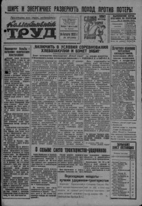 ШИЕР И ЭНЕРГИЧНЕЕ РАЗВЕРНУТЬ ПОХОД ПРОТИВ ПОТЕРЬ! Пролетарии всех стран, соединяйтесь! В С е.иаА ш €м Ш •Т Р У Д Орган Карасукского Райкома ВКП(б) и Райисполкома Зац. Сиб. края Выходит 1раз в5дней . Ст. Кэрасук 14август19а35г М 39 (393) 59970 центнер. район ВЫПОЛНЕНИЕ ЗЕРНОПОСТАВОК ПО СЕКТОРАМ На 13 августа 1935 г. Недпоцеда борьбы с потерями—вгпкчакшее преступление wtabCKHli пленум Центрального Комитета ВКП(ба),вслед за ним пленум Крайкома партии с предель иой четкостью определили юзя-й етввнно-политкчвское значение и врактнчшиемероприятия борьбы с потерями приубсрки урожая. Ашиано, находятся такие „йвкоы шЖш!и“ среди руководителей колхозов и бригадиров, которым не подсилуоказалосьусвоить и решить задачи по-большевистски, сломить хребет оаботажннкам, сокрушить кулацкое противодействие. 3 результата мы имеем такие, например, фанты, когда хлеб из зерноуловителей не выгребается или выгребается только два раза в день (колхоз „Скотовод"). Творится водлойшнй Обман, причиняется огро миейший ущерб колхозу и колхоз никам. Столь же ^ утитешы и преступны факты игнорирования вязни околов вколхозах .Нвоый отрйо". имЛндрееаа, хм.Зйхеи других. В этУ колхозах(а таких колхозов 1) нет и одного снооа связанного хлеоа. Прямым вредительством несетот такого дела, как например, вколхозе„Верный путь" (председатель Добровольский), где с метровкой в руках установлена потеря зерна, превышающая полтора центнера на гектаре. Врядеколхозов плохоподгребают ся колосья и но организован их сбо.рНередки также случаи, когда не чисто обмолачивается хлеб и в солому попадает много зерна (кол хоз «Батрак»„МаякИльича", .Крас ный Перекоп". В колхозе им. Жданов„аКр, ас ном фронтовике" идругих неоргане зовано скиродвнаие. Мы называем воро и. расхтите лемсоциалистической собственности, врагом народавсякого, иго посмеет покушаться наколхозное, на государ отаеше добро. Мы обрушиваемна поды этих людей закон правитель стай о-т 7 августа, А разве тот, кто разбрасывает хлеб по полосе, нто не принимает меркеголучшей сохранности (через вязну, еанрдова кие и т. д.) творит нс таксе же преступление против интересов государства, колхозаи колхозников? По отношению к таким людям мы должныдействовать со всей реши- тельнностью. Никаких снисхождений, никаких уступок! Каждое из мероприятий по борьбе с потерями, каждое требо- манме на этотсчет, предъявленное партией л правительством должно быть в точности выполнение. Публикуемое сегодня постановление бюро Райкома л президиума Раиймолкогомвораитобэтмосовсей шо|* со всей решиетльностью. „ВКЛЮ ЧИТЬ В УСЛОВИЯ СОРЕВНОВАНИЯ Х Л ЕБ ОЗАКУПКИ И ВЗМЕТ ЗЯБИ! Ответ колхозников сельхозартели „Новый строй* на письмо делегатов II Всесоюзного съезда колхозникоа-ударииков т. т. УЗДЕЕВА Л. С. н САЙ*0 У, П. Одобряем хороший по- ЭЛЕВАТОР. 77 центнер Весь оставшийся на чин делегатов 11-го Все союзного с’езда колхоз- ников-ударников товари щей У З Д Е Е В А иСАЙ К О, Включаемся в борьбу за первенство района в хлебопоставках и убороч ной, за право рапорта товарищам Э Й X Е и Г Р ЯДИНСКОМУ . 7 го августа КРАСНЫМ ОБОЗОМ ИМЕНИ VII КОНГРЕССА КОМИН ТЕРНА мы подняли сразу 293 центнера хлеба и этим завершили постав ку хлеба своему пролетарскому государству. Впервые за все годы, в небывало короткий срок мы справились с этой самой важной задачей. Это нас чрезвычайно радует и дает нам силы для бо