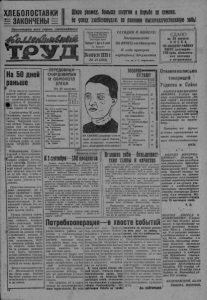 4. КОЛЛЕКТИВНЫЙ т р у д Райисполкома В президиуме 09уставах колхозов Президиум Райисполкома отметил, что отдельные пункты ^уставов, принятых колхозами, заключает в себе отступления от примерного устава сельхозартели и постановления Западно- Сибирского Крайисполкома и Крайкома ВКП(б)а „О мероприятиях по выработке, обсуждению и принятию колхозами уставов сельскохозяйственной артели по Западно-Сибирскому краю“. Размер приусадебной земли в личном пользовании колхозников установлен в твердей величине (0,80—0,85—0,90—1 гектар), тогда как нужно было установить и записать „от 0,80 до 1 гектара". В разделе 4, параграфе 6 не точно формулированы пункты „д“ и „ж“. Неправильно в ряде случаев решен вопрос об оплате колхоз- ' никами за подводы для личных нужд. Президиум Райисполкома также отметил, что руководящий состав колхозов и представители советской власти на местах не используют по-настоящему устав, как могучий действенный рычаг в борьбе за большевистские колхозы, за зажиточную культурную жизнь колхозников. Президиум Райисполкома постановил коман дировать в колхозы членов РИК’а для проведения работы как по устранению (через общие колхозные собрания) допущенных извращений в уставах, так и для проверки выполнения устава. Одновременно президиум Райисполкома обя зал всех руководителей колхозов хранить устав по всем правилам хранения ценных документов. Офинансовых делах колхозов Президиум^Райисполкома создал специальную комиссию содействия ликвидации дебиторской и кредиторской задолженности в колхозах. В состав комиссии вошти: заведывающий РайФО(председатель комиссии), начальник РайЗО и представитель Госбанка. В ближайшие дни комиссия рассмотрит мяте риалы о просроченной задолженности колхозов друг Другу, а также задолженности колхозам хозяйственно — кооперативными организациями. Все такие дела до 5 тысяч рублей будут на правлены в народныйсуд, а свыше 5 тысяч будут переданы государственному арбитру, который прибудет в район в первых числах сентября. Орайонной (ельхозвышше Президиум Райисполкома постановил организовать-в текущем году двухдневную районную сельскохозяйственную выставку. Выставка о должна состояться 28-29 сентября. Утвержден выставочный комитет. В его составе—делегат ||-го Всесоюзного с'езда колхоз- ников-ударников, товарищ УЗДЕЕВ Леонтий Сергеевич и делегат Ш го Краевого с'езда кол хозников-ударников, товарищ ЮРИН Николай Григорьевич. ПО СОВЕТСКОМУ СОЮЗУ 22!) гектар на один комбайн в среднем В зерносовхозах Советского Сою за убраны комбайнами вое хлеба, Вместо установленного правитель ствол слана' уборки комбайнами по МТС 100 тысяч гектаров, убра но 138 тысяч гектаров. В среднем на один комбайн убрано 225 гектар хлеба. (ТАСС) Перепет Леваневского перенесен до 1936 года Наблюдения над погодой в СС Р, а также в Америке и, вытекаю щне из них, предсказания поп не далн еозможности до сих пор возобновить перелет Лззанезского. Между тем. середина августа является предельным сроком для перелета через Северный полюс. На хорошую погоду в Арктике осенью рассчитывать не приходит ся- В связи с этим принято реше ннв отложить перелет Леваневского до лета. 1836-го года. (ТАСС) Конный пробег Ашхабад— Москва завершен 22 августа- в Москву прибыл отряд конников, совершивший про бег Ашивад-Мосш расстоянием 4 тысячи километров. В отряде луч 