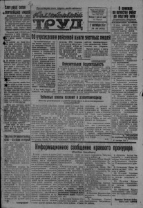Слетдвух сотен «зввшйищ людйе Двенадцатого онтября, в первый день сельенохозяйстееннсЛ выставке откроется районный слет ударников Дев cciHK знатнейших людей района— представителей ударных колонн колхозов. МТС и совхозов соберутся для того, чтобы подвести итоги сталинсяогс пронзардзтвеннсг оисхода Совпадение дней районной сзяь- хозвыошкн н слета ударников— Г ленне не случайнее. Одно собы- е с другка связано m u i m i i разомА На выставке мы будем иметь Ш к а з наших достижений, завэеззн- ных сод руководством партии н великого вождя товарища СТАЛИНА я благодаря ншнозкену строю. На слете же будут представлены те лучшие борды, которые возглавляли л т за эти достижения, увлекая зг собой ширинке массы колхозников. ■* До выставки и слета остаются вввногив дин. Задачи под- готезки к этим езбытшт чрезвычайно велики о оштственны. Особо нужно сказать о подготовка к слету уд?рннно8. Работа в этом направлении только что начались. Здесь сельским советам, партийным #" к а м ш о л н ш организация» при,- шевжнт ишь: чнтельно ош теш и - ьфроль На слет у д р я ш должны быть кЖакы лучшиеиз лучших-ударники. И щ щ кандидатуру надо обсудить на собрании нолхизннков и рабочих. Проверить показатели работы. Выявить общественно-политическую роль каждого кандидата, его роль в организации соревнования, проверка договоров, выполнении обязательств перед государством я в -борьбе за новый быт и новую культуру. Жизнь идет быстрыми шагами вперед. Возрастают задачи, еозрэ -V уают требования к каждому ра- ш ъ щ . И подлинным ударгозм может считаться лишь тот, кто у. идет я н.гу с жизнью, выполняет порученное дело на отлично, проясняет собственную -творческую.ини- циашу и вешает отстающим под- Г пяться до уровня передовых. Таких людей не гналов нзшеая районе и нм по праву принадлежи! занять места на слета двух сот знатнейших людей района. шсатмАвлп ств—апрмеияшурой 11 сентября состоялось заседание правления кол- , хоза „Кавказский трудовик" при участии всего колхозного актива и чле нов сельсовета. «На . этом заседании -лодведены итоги борьбы за сохранение молодняка скота и присуждены премии натурой лучшим ударникам животноводства. Правление решило вы дать в премию но теленку дояркам Толстиковой иЛок тевой,/Пастуху овец—комсомольцу Евдокимову Ивану и двум другим работникам овцеводства,—Уколову П. и Даиьшиной, а также доярке Орда—по ягненку. Боляровой и Литовчеико, - ухаживающим за свиньями, —по поросенку. Ветсани- К тар Воскобойник получил ягненка и 25 рублей деньгами, заведывигощий фермой Уколов А. получил ягненка и 50 рублей деньСдвоарвввкмй Пролетарии всех стран, соединяйтесь! Орган Карасукского Райкома ВКП(б) и Райисполкома Заи.-Сиб. края Выходят 1 раз в 5 рей Ст. Кзрасук 1откябр5я 3 Г- № 46 (400) т к н и районкойш н знатныхлюден Производственный поход имени волияого вождя товарища Сталина вызвал небывалую волну социалистического еорев нования и ударничества в колхозах, совхозах, МТС и сельсоветах. В целях учета и показа лучших образцов работы, лучших ударников-отлич- ннков. иглвна которых должен знать весь район, и ис пользования их опыта боль шевистской борьбы на хозяйственном, культурном и других фронтах на дальнейших этапах сталинского похода— президиум Райисполкома и бюро Райкома ВКП(б),идя на встречу пред ложе кию самих масс, реши ли учредить РАЙОННУЮ КНИГУ ЗНАТНЫХ ЛЮДЕЙ .