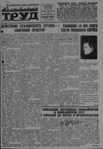 Пролетарии всех стран, соединяйтесь! ТРЗЕД Орган Карасукского Райкома ВКП(б) и Райисполкома Заи.-Сиб. края Выидит 1 раз е 5 дней Ст. Карасук 1 декабря1935г- № 54 (408) ДЕЙСТВИЮ СТАЛИНСКОГО УСТАВА . ШИРОКИЙ ПРОСТОР ПОСТАНОВЛЕНИЕ СОВЕТА НАРОДНЫХ КОМИССАРОВ СОЮЗА ССР И ЦЕНТРАЛЬНОГО КОМИТЕТА ВКП(б) В связи с тем, что Московская область, Сталинградский край, Клав' екая, Чврнигоасная, Донецкая, Днепропетровская, Одесская области и Молдавская AGGP выполнили установленный для нихСовнаркомом СССР и ЦКВНП(б) годовой план хлебосдачи к обеспечили себя семенами для ярового сева Совет Народных Комиссаров Союза GCP и Центральный Комитет ВКП(б) постановляют: разрешить колхоза», колхозникам итрудящимся единоличникам поименованных областей, края и республики производить беспрепятственную продажу своего хлеба мукой, зерном и печеным хлебом кооперативным организациям, а тан же на городских и сельских базарах и станциях железных дорог. Председатель Совета Народных Комиссаров СССР В. Молотов, Секретарь Центрального Комитета ВКП(б) И. СТАЛИН. Годовщина со дня смерти СергеяК щ м т КИРОВА Семнадцатого февраля 1936 года исполнится год со дня принятия Вторым Всесоюзным С'ездом кол- хозников-ударников и утверждения Советом Народны? Комиссаров СССР и Центральным Комитетом ВКП(б) €Примерного устава сельскохозяйственной артели». Этот ценнейший документ нашего времени, неразрывно связанный с именем великого вождя трудового народа товарища Ста ЛЙН1, с первых же дней своего появления в свет стал могучим орудием- сплоче широких колхозных а Шс на борьбу за новые небывалые победы в деле укрепления колхозного строя, превращения всех колхозов в большевистские, а колхозников в эажиточ ных. Вооружившись СТАЛИНСКИМ УСТАВОМ^ колхозы нашего района добились в утекающем году целого ряда блестящих успехов. Крупнейшие из них—выполнение обязательств по всем видам зернопоставок к 23 августа (на 50 дней раньше против 1934 года), завершение всего обмолота хлеба в районе к 5 сентября и крупнейшая победа в ^борьбе с засухой. Резкий поворот в сторону улучшения качества обработки земли, выполнения требований агротехники, проведения работ в сжатые сроки настолько ослабили влияние засухи, что многие колхозы собрали урожай не меньший, чем в 1934 высокоурожайном году. Это дало возможность колхозам и колхозникам продать государству около 30 тысяч центеров своих хлебных излишков. рачительно улучшилось дело в области животноводстве. На 19 процентов протир прошлого года возросло поголовье крупного рогатого скота в/районе, на 50 процентов—количество овец, на 162 процента— выходное погодобье свиней, на 7,1 процента--количество лошадей. Многие колхозники уже полностью воспользовались своим правом, предоставленным новым уставом, в части обзаведения скотом для личного пользования. У них есть столько скота, сколько допустимо иметь по уставу, в десятки раз- нойзптицы. т а базе организационнохозяйственного укрепления колхозов и зажиточности колхозников растут культурные запросы. Развернувшийся в районе культурно—бытовой поход является подтверждением и выражением этого факта. Однако, далеко еще не полностью используется мо гучая сила СТАЛИНСКОГО УСТАВА.Среди руководите лей колхозов можно встретить и таких людей, которые плохо еще осмыслили, как надо применять устав в практике своей повседневной