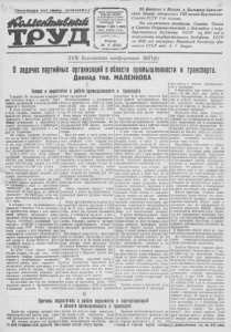 Пролетарии всех стран, соединяемы ь ! ^ЛмеАлЛшА ТРУД Г Оргьа Карасужсжог» ' Ржавом* ВКП(б) ж Районного Совета депутатов трудящихся Алтайского края Выкшт 4 раза в м « сй « цена номера 8 коп. 4 МАРТА 1941 г. Вторник к Л» Д J 25 февраля в Москве. в Большом кремлев ском дворце, открылась VIII сессия Верховного Совета СССР 1го созыва, fía совместном заседании Совета Союза и Совета Национальностей с докладом о госу дарственном бюджете СССР ня 1941 год и исполнении государственного бюджета СССР за 1939 год выступил Народный Комиссар фи нансов СССР тов. А, Г. Зверев. ------------------------------------------------ _ ------------------------------- --- M-u'T Jx ■ лидц-де™.' .. i и. ■. Д ^^^^^^^^дидвядваааамддддяандаддд XVIII Всесоюзная конференция ВКП(б) О задачах партийных организаций в области промышленности и транспорта. Доклад тов. МАЛЕНКОВА Успехи и недостатки в работе промышленности Товарищи! На обсуждение конферен ции поставлен вопрос о задачах пар тийных организаций в области промыш ленности и транспорта. В своем докладе по этому вопросу я буду говорить, главным образом, о недостатках работы промышленности и транспорта, о недостатках работы пар тийных организаций и наркоматов в области промышленности и транспорта, о причинах этих недостатков п о ме рах их устранения. Это отнюдь, товарищи, не означает, что мы не имеем успехов в работе про мышленности и транспорта. Наоборот, за два года-, истекшие после XVIII с ‘ ез да партии, продолжался неуклонный рост промышленности и транспорта. Если в 1938 году об'ом валовой продукции промышленности составил 106.»34 млн. рублей, то в 1939 г. он достиг 123,914 млн. рублен, а в 1940 году составил 135,500 млн. рублей. Следовательно, из года в год мы имеем огромный прирост валовой про дукции промышленности. Улучшилась за истекшие два года и работа нашего транспорта. В 1940 г. по сравнению с 1938 г. грузооборот увеличился: по железнодорожному, транспорту на 10,3 проц, по речному транспорту — на 12,8 проц, и по мор скому транспорту в малом каботаже — на 15,1 проц. В истекшем году промышленность и транспорт Советского Союза значитель но продвинулись вперед в деле выпол нения третьего пятилетнего плана, увеличили об'ем производства и грузо оборота, обеспечили дальнейший рост народного хозяйства и укрепление обо ронной мощи СССР. Успехи освоения новой техники и рост оборонной про мышленности позволили значительно по высить техническую оснащенность Крас ной Армии и Военно-Морского флота новейшими видами и типами современ ного вооружения. На XVIII с'езде партии товарищ Сталии говорил, что для того, чтобы перегнать главные капиталистические страны в экономическом отношении, требуется прежде всего серьезное и неукротимое желание итти вперед и го товность пойти на жертвы, пойти на серьезные капитальные вложения для всемерного расширения нашей социали стической промышленности. За истекшие два года мы вложили огромные средства в промышленность и, транспорт пустили в ход много Какие же, товарищи, причины неу довлетворительной работы ряда отрас лей промышленности и транспорта ? Мы обязаны вскрыть эти причины №¡1 бодившстсИ дрямотоВ. Чэд новых предприятий. Капиталовложения в промышлен ность и транспорт зз 1938 год соста вили 22.341 млн. рублей, за 1939 год — 25,037 млн. рублей, за 1940 год — 27,728 млн. рублей. Наша партия неуклонно проводит в жизнь учение товарища Сталина о со циалистической индустриализации. Ин дустриа