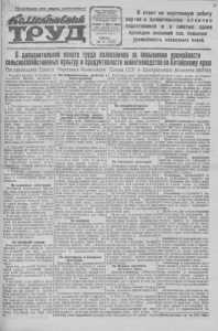 Пролетарии всех стран, соединяйтесь'. ТРУД Орган Кары Райкома 1_ ___ я Районного Совета депутатов трудящихся Алтай ского края Оыюдхт 4 ран । месяц цена номера 8 коп, 22 МАРТА. 1911г. БуШта В ответ на неустанную заботу партии и правительства отлично подготовимся и в сжатые сроки проведем весенний сев, повысим урожайность колхозных полей. О дополнительной оплате труда колхозников за повышенно урожайности сельскохозяйственных культур и продуктивности животноводства по Алтайскому краю Союза ССР и Центрального Комитета ВКП(б) Народных Комиссаров По подсолнечнику, рыжину и льну-нудряшу Колхозники звена перевыполнившие план урожайности подсолнечника на площади посева, закрепленной за зве ном, и колхозники полеводческой бри гады или звена, перевыполнившие план урожайности рыжика и льна-кудряша на закрепленной за бригадой пли зве ном площади посева, получают третью часть семян, собранных сверх уставов леиного по плану для звена или бри гады урожая по этим культурам. По льну-долгунцу, средне русской и южной конопле Колхозники звена, перевыполнившие план урожайности дьна-долгунца, или средне-русской п южной конопли на площади посева, закрепленной за зве ном, получают третью часть волокна из расчета среднего номера и третью часть семян, собранных сверх установленно го для каждого звена плана урожай ности . Кроме того, колхозники звена полу чают дополнительную оплату деньгами за каждый центнер ’ волокна и семян, полученный сверх установленного кол хозом звену плана сдачи из расчета третьей части средней стоимости по колхозу одного центнера волокна и се мян, включая сюду основную оплату ц премии-надбавки, получаемые колхозом за перевыполнение плава сдачи. Колхозники звена семеноводческого колхоза, перевыполнившие план уро жайности семян и волокна льна-долгун па и конопли, получают дополнитель ную оплату деньгами в размере поло вины стоимости по колхозу каждого центнера семян и волокна льнд-долгун- ца и конопли, сданного колхозом госу дарству сверх плана сдачи, включая сюда основную оплату и премии-над бавки, а также получают натурой третью часть урожая волокна, собран ного сверх установленного для звена плана урожайности. По махорне За каждый центнер махорки, получен ный сверх плана урожайности на за крепленной за звеном площади посе вов, колхозники этого звена получают дополнительную оплату деньгами, из расчета 50 проц, средней оплаты за готпунктом по колхозу одного центне ра махорки, включая сюда основную оплату и премии-надбавки, получаемые колхозом за перевыполнение плана сдачи. По картофелю и овощным культурам Колхозники звена, перевыполнившие план урожайности картофеля и овощ ных культур — капусты, помидоров, огурцов, свеклы столовой, моркови сто ловой и лука на всей площади посева, закрепленной за звеном, получают третью часть урожая картофеля и овощ ных культур, собранного сверх установ ленного для звена плана урожайнос ти. Колхозники звена, перевыполнившие план выращивания овощей в парниках и теплицах, получают за каждый цен тнер сверхплановой урожайности одну третью часть средней продажной сто имости по колхозу одного центнера ово щей закрытого грунта при условии вы- полненп^ плана выращивания рассады. Постановление Совета Учитывая просьбы колхозников и ходатайства местных партийных и советских организаций Алта