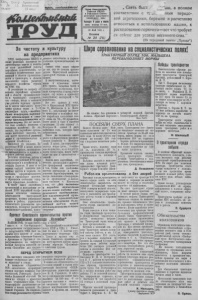 j KBA, Центр К № 13 палате Армянский Всесоюзной (4 экз,) м труд тран, соединяйтесь'. 20 МАЯ 1941 г. Орган Карасувскога ' Райкома ВКП(б) ■ Районного Совета депутатов трудящихся Алтайского края Зыходит 4 раза а тисни цена номера 13 коп, Вторник „ Сеять быст Е нХ Ш0 » в полном соответствии с Т| , ... зями передо- вой агротехники, бережно и расчетливо относиться к использованию машин, к расходованию горючего — вот что требует ся сейчас для успеха весеннего сева. ” (Из передовой газеты »Правда") За чистоту и культуру на предприятиях XVIII конференция ВКП(б) в своих решениях поставила ве личественные задачи и намети ла пути дальнейшей работы партийных, комсомольских, со ветских и хозяйственных орга низаций в области промышлен ности и транспорта, в области выполнения плана развития народного хозяйства страны на 1941 год. В резолюции по вопросу «0 задачах партийных организа ций в области промышленнос ти и транспорта» говорится, что «теперь, когда в основном уже решены зерновая пробле ма и задача ежегодного полу чения урожая зерна в 7 — 8 миллиардов пудов, — необхо димо повернуть партий ные организации в сто рону промышленности и транспорта. Это не значит, что надо ослабить внимание к сельскому хозяйству. Но это значит, что партийные органи зации настолько выросли, что они могут заняться в равной мере и промышленностью и сельским хозяйством.» Выполняя это указание, Ка- расукская МТМ в цехах навела чистоту и порядок, ликвидирова ла захламленность и привела в порядок рабочие места. Большая проделана работа в выполнении решений XVIII парт конференции и в хозяйстве ж. д. станции Карасук. В депо и то варных складах наведена пол нейшая чистота и порядок, по высилась производительность труда и грузооборот вагонов, в образцовом состоянии содер жится стрелочное хозяйство. К числу задач партийных организаций в выполнении ре шений XVIII партийной конфе ренции относятся снижение себестоимости выпускаемой продукции, полная ликвидация браков в работе, укрепление технического руководства про изводством, всемерное развитие стахановского движения, повсе- Протест Советского правительства постив задержания парохода „Колумбия" ВАШИНГТОН, 15 мая (ТАСС). 7. мая с. г. в Сан-Франциско распоряжением государственно го департамента США был за держан груз шерсти и кожи, закупленных Советским Союзом в Аргентине и Уругвае и пе регружавшихся на зафрахто ванный Амторгом шведский па роход «Колумбия» для следова ПЕРЕД ОТКРЫТИЕМ ВСХВ На выставку ежедневно при бывают отобранные для пока за животные и птицы. В павильоне «Украинская ССР» закончилось оформление стендов молодых колхозов Тар нопольской, Ровенской, Львов ской и Волынской областей. На одном из стендов — красочное панно гуцульского села. Оно иллюстрирует разительные пе ремены в жизни крестьян За падной Украины. На специаль ном стенде размещаются образцы дневное выполнение и перевы полнение производственных за даний. Однако этих задач видимо до сих пор не поняли руково дители Карасукской машинно- тракторной станции и мясоком бината. В инструментальном, монта жном и кузнечном цехах МТС грязно, запасные части и оборудование разбросаны, куз ница превращена в склад утиль сырья, сор вошел в привычку заведующему мастерской т. Че редниченко/ Все это привело к тому, что в Карасукской МТС брига ды тт. Шестакова А. и Пона рина Е., работающи