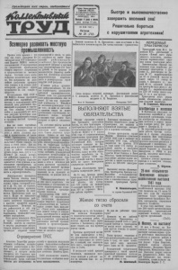 Пролетарии всех стран, соединяйтесь'. ТРУД Оргав Карасукског» Рай сома ВКП(б) ж Районного Совета депутатов трудящихся Алтайского края Выходит 4 рам i »caí цена номера 13 коп, 23 МАЯ 1941 г. Пятница № 21 (712> Быстро и высококачественно завершить весенний сев! Решительно бороться с нарушителями агротехники! Всемерно развивать местную Экипаж капитана И. Ф. Преснякова — один из лучших в За байкальском военном округе. Все члены экипажа — орденоносцы. ПЕРЕДОВЫЕ ТРАКТОРИСТЫ Прошло пять месяцев с тех пор, как Совет Народных Ко миссаров Союза ССР и Централь ный Комитет ВКП(б) вынесли постановление «О мероприятиях по увеличению производства товаров широкого потребления и продовольствия из местного сырья». Значение этого поста новления исключительно вели ко. Оно направлено на даль нейшее увеличение производ ства товаров и на полное удов летворение растущего спроса трудящихся на эти товары и продукты. Постановление СПК СССР и ЦК ВКП(б) — боевая программа действий всех партийных, со ветских и комсомольских орга низаций, всех работников про мысловой кооперации и торгов ли. Они обязаны полностью найти и использовать все мест ные ресурсы, из которых мож но было бы вырабатывать товары и продукты местной промыш ленности. Как же наши партийные, советские и кооперативные ор ганизации реализуют, претво ряют в жизнь указания пар тии и правительства об увели чении производства товаров широкого потребления и продо вольствия? Нужно сказать, что очень и очень плохо. При на личии лесов местного значения, у нас в районе невозможно купить ходок, сани, дугу и т. д. Почему? Да только потому, что райлесхоз (директор т. По номаренко), которому поручено заниматься этим нужным и не обходимым производством, не организовал эту работу, прояв ляет недопустимую бездеятель ность и неразворотливость, Лепокуровская промартель имени Чкалова обязана зани маться изготовлением табуреток, корзин, ложек, гончарной посу ды и др. Но, как не странно, промысловая артель производ ством этих предметов не зани мается. Председатель этой ар тели т. Кудря не выполняет постановление исполкома рай совета депутатов трудящихся о выпуске предметов первой необходимости. Несмотря на это, райисполком до сих пор не призвал к порядку этого бездельника, срывающего важ нейшее мероприятие. Если артель инвалидов «Путь к труду» (председатель тов. Ровный), заметно из квартала в квартал увеличивает выпуск товаров широкого потребления, организует открытие новых промышленность предприятий и цехов, то ниче го подобного не имеет Кара- сукский райпище пром комбинат. Для строительства макаронной фабрики в текущем году запроектировано 123 тыся чи рублей, но эти средства не используются. Директор комби ната тов. Логвиненко допускает непростительную медлитель ность в развертывании строи тельства этой фабрики. В нашем районе организо ван райпромкомбинат. Он обя зан осуществлять руководство 8айонной промышленностью, днако пока что руководящей роли райпромкомбината еще не видно. До сих пор управляю щий комбинатом т. Михайлов не возглавил руководство и ху же того, он даже до настояще го времени никак не может организовать строительство ко жевенного завода, который в текущем году должен быть построен и сдан в эксплоата- цию. За состояние работы местной промышленности целиком и полностью несут ответствен ность Со