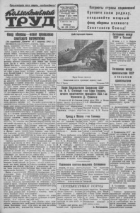 Пролетарий всех стран, соединяйтесь! ТРУД Г Оргдн Каржсужсжом V РжАжом» ВКП(б) ж Районного Совета I депутатов трудящихся I А лтай ского жрая I Выходи 4 раза о моей цена номера 13 коп, I 8 АВГУСТА 1941 г. Пятница I 39 Патриоты страны социализма! Крепите свою родину, создавайте мощный фонд обороны великого Советского Союза! Фонд обороиы новое проявление советского потриотизмн (Из передовой „Правды “ за 1 августа 1941 г.) НЕСГИБАЕМА воля советского народа, напрягшего свои бога тырские силы, чтобы смести с лица земли гнусное фашистское отребье. Гордые за своих геро ических бойцов, самозабвенно сражающихся на поле битвы, советские патриоты, оставшиеся в тылу, горят неудержимым желанием неустанно укреплять фронт. Все ли я сделал для фронта? Эта -мысль постоянно волнует каждого человека на шей страны, вызывая к жизни все новые и новые формы по мощи Красной Армии и Воен но-Морскому Флоту. Одним из замечательных про явлений советского патриотиз ма являются многочисленные предложения о создании фонда обороны. Инициатива эта созре ла среди людей, живущих в самых различных концах на шей необ'ятной родины. Уже это одно свидетельствует о мас совости этой народной инициа тивы, подсказанной благород ным патриотическим чувством. Целые коллективы фабрик, за водов, колхозов, научных уч реждений, вузов, отдельные гра ждане шлют письма в редакции центральных и местных газет, в финансовые органы, заявляя о своей готовности не только тру дом, но и личными средствами участвовать в дополнительном выпуске самолетов, танков, орудий, снарядов, пулеметов, всего того, что огненным смер чем должно обрушиться на го ловы коварного врага. «Каж дая трудовая копейка, — -пишет автор одного из поступивших в «Правду» писем, — увеличи вает количество металла для обороны, а каждый килограмм металла есть удар по фашист ским псам». Советское правительство, со ветский народ никогда не жа лели средств для усиления мо щи вооруженных сил страны. Наши оборонные предприятия работают на полный ход, не прерывно увеличивая выпуск необходимой для фронта про дукции. Но вполне понятно и законно желание советских пат риотов в грозные часы, пере живаемые нашей любимой ро диной, дать новые средства на священное дело обороны стра ны, чтобы ускорить победу над гитлеровскими варварами. Письма с предложениями об организации фонда обороны тысячами поступают из горо дов и сел, с фронта и тыла. Эти письма нельзя читать без волнения. Работницы, проводив мужей на фронт, отчисляют в фонд обороны однодневный за работок. Домашние хозяйки приносят золотые и серебряные вещи. Дети, раскрыв свои ко пилки, извлекают оттуда меся цами накопленные монеты и передают в фонд обороны. Пен сионеры, из-за старости или болезни лишенные возможности работать, выделяют часть своей пенсии. Колхозники сдают в фонд обороны мясо, молочные продукты, зерно. Одна из комсомольских групп московского автозавода имени Сталина в своем письме заяв ляет: «Лучшие сыны нашего народа сражаются в рядах Крас ной Армии, Красного Флота и Авиации против зарвавшегося фашистского зверя. Чтобы дать в руки бойцов еще больше новейшего оружия, мы будем вносить в фонд обороны каж дый месяц свой двухдневный заработок до тех пор, пока не будет уничтожен проклятый враг. Пусть на наши средства будут строиться мощные бом бардировщики, которые будут громит