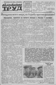 Пролетарий всех стран, соединяйтесь'. ТРУД Орган Караеуксксга * Райкома ВКП(б) е Районного Совета депутатов трудящихся Алтайского края ВЫ1ОЛ1Т 4 pasa i »сяц цена номера 13 коп, 15 СЕНТЯБРЯ 1941 г. Понедельник „Нужно, чтобы каждый рабочий в каждом собрании, в каждой мастерской сделал теперь главным предметом своих бесед, докладов и собраний: все на помощь Красной армии. Спросим себя: все ли мы сделали, что зависело от нас, чтобы помочь Красной армии? “ В. И. ЛЕНИН. Женщины всего мира, на борьбу против фашизма! Обращение, принятое на митинге женщин в Москве 7 сентября Опьяненные кровью, орды фашистских варваров глумятся над религиозными чувствами женщин — католичек и протестан ток, оскверняя храмы и грабя церковную утварь. Нельзя передать словами того, что чинят фашистские злодеи с женщиной во времен но захваченных ими районах советской страны. Их садизму нет предела. Эти подлые трусы гонят впереди себя женщин, детей и стариков, чтобы ук рыться от огня Красной Армии. Изнасилованным ими жертвам они вспарывают животы, выре зают груди, они давят их ма шинами, разрывают танками. Слушайте, сестры, о крова вых преступлениях немецко- фашистских мерзавцев! В укра инском селении они изнасило вали Евгению Пазур, затем отрезали ей груди и натерли израненное тело солью. На глазах матерей они пы тают и убивают малолетних детей. В белорусской деревне озверелый немецкий солдат из бил прикладом мальчика Сашу Сергуна. Обезумевшая мать пыталась телом своим защитить мальчика. Ее закололи вместе с сыном. В самой Германии у немец ких матерей Гитлер украл де тей, превратил их в банду оз верелых убийц и преступников. Поруганную немецкую женщи ну он низвел до унизительно го положения рабыни. Жен щина в гитлеровской Герма нии — это машина для произ водства солдат. Гитлеровское государство обращается с ней, как хозяин стада со скотиной, дающей приплод. Женщина-мать! К тебе взы вает кровь детей, убитых в Варшаве и растерзанных в Бресте! Вчера фашистские са молеты бомбили детей в Лон доне, Риге и Пскове, завтра они будут пытаться уничто жить детей в Ныо-Иорке. Невесты и жены! Фашизм отнимает у вас семью и любовь, он истребляет ваших мужей, женихов и братьев. Во имя свободы ваших на родов, во имя счастья ваших детей вставайте все на священ ную войну с гитлеризмом. Не сломить фашистским из вергам мужества советской женщины. Рука об руку с Крас ной Армией, принявшей на се бя главную тяжесть удара гитлеровских полчищ, непоко лебимо стоит советская жен щина на своем посту. Чем боль ше свирепствует враг, тем крепче ее сердце и воля к по беде. На передовых позициях она оказывает помощь раненым. Она тушит пожары, вызван ные фашистскими летчиками. Она стоит у станка, производя оружие и снаряды. Она дерет ся в партизанских отрядах вместе с мужем и сыном. Ее мысли, ее ролю выразила про К женщинам всего мира! К вам, независимо от ваших по литических убеждений, религи озных верований, социального положения, обращаемся мы от имени миллионов советскех жен щин. Перед лицом общей опаснос ти, угрожающей всему цивили зованному человечеству, мы обращаемся к вашему чувству и разуму. Изверг Гитлер, заливший кровью Европу, ведет войну не только против Советского Сою за и Великобритании. Он хочет поработить все свободолюбивые народы Европы и Америки. Фашистские орды Гитлера не знают ни веры, ни закона, н