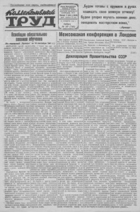 Пролетарии всех стран, соединяйтесь'. Орган Карасукскога * Райком* ВКП(б) и Районного Совета депутатов трудящихся Алтайского края Выходят 4 pua я хзсяя цена номера 13 коп, 27 СЕНТЯБРЯ 1941 г. Суббота „Будем готовы с оружием в рунах защищать свою великую отчизну! Будем упорно изучать военное дело, овладевать мастерством воина. “ (.Правда) Всеобщее обязательное военное обучение (Из передовой „Правды “ за 18 сентября 1941 г.) Межсоюзная конференция в Лондоне КОНЧАЕТСЯ третий месяц великой отечественной войны Советского Союза с германским фашизмом. Стремясь добиться решающих успехов до наступ ления зимы, немецкое коман дование бросает в бой новые резервы. Новые планы гитле ровской ставки срываются оже сточенным сопротивлением доб лестной Красной Армии, Воен но-Морского Флота и нашей авиации. Война приобретает затяжной характер длительного и жестокого состязания, подвер гающего испытанию все ресур сы воюющих сторон. Великий Ленин учил: «Побеж дает на войне тот, у кого боль ше резервов, больше источни ков силы, больше выдержки в народной толще». Каждому яс но, что источников силы, вы держки и поддержки в народ ной толще у нас больше. В то время, как людские резер вы Германии иссякают, силы Красной Армии неуклонно воз растают. На борьбу с ненавистным врагом вместе с Красной Арми ей поднялись сотни тысяч, мил лионы рабочих, колхозников и интеллигенции,поднимается весь советский народ-исполин. Каж дый день войны свидетельствует об огромном патриотическом под'еме, охватившем всю стра ну. В ответ на призыв товари ща Сталина тысячи и тысячи лучших сынов народа вошли в отряды народного ополчения и истребительные батальоны. В городах и селах Советского Со юза советские патриоты без отрыва от производства обучают ся военному делу. Но современная война тре бует не просто военно-грамот ных людей, а квалифицирован ных воинов, обладающих вы сокой боевой подготовкой. Поэ тому публикуемое сегодня пос тановление Государственного Комитета Обороны о всеобщем обязательном обучении военно му делу граждан СССР имеет огромное политическое и воен ное значение. Каждый гражда нин Советского Союза, способ ный носить оружие, должен быть обучен военному делу, быть подготовленным с ору жием в руках защищать свою родину. Будущий боец Красной Ар мии должен знать строй, уметь метко стрелять, метать грана ту, вести штыковой бой, бо роться против танков против ника, уметь маскироваться, ук рываться от артиллерийского и минометного огня, от нале тов авиации, уметь пользовать ся средствами ПВХО. Нужно развивать среди обучающихся выносливость и сноровку, куль тивировать смелость и наход чивость, прививать им высокую воинскую дисциплину — основу силы армии. Обучение должно быть кон кретным и ясным. Нужно учить только тому, что нужно на войне, и только так, как это требуется на войне. Никакой условности в обучении, ника кой «словесности»! Мы готовим бойцов к действиям в очень сложной обстановке, вусл)виях взаимодействия всех родов оружия. Воин Красной Армии должен быть готов во всеору жии встретить сильного врага. При прохождении обязатель ной программы чрезвычайно важно учесть и довести до каж дого обучающегося боевой опыт частей Красной Армии. В упор ных сражениях с немецко-фа шистскими войсками наши части и подразделения накопили ог ромный опыт. Они научились разгадыва