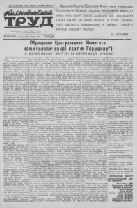 Пролетарии всех стран, соединяйтесь'. ТРУД Орган Карасукского Райкома ВКП(б) и Районного Совета депутатов трудящихся Алтайского края №55 (746) | четверг 23 октября 1941 г. цена номера 13 коп. Красная Армия, Красный Флот и все граждане Советского Союза должны отстаивать каждую пядь советской земли, драться до последней капли крови за наши города и села, прояв лять смелость, инициативу и сметку, свойст венные нашему народу. И. СТАЛИН Обращение Центрального Комитета коммунистической партии Германии*) К НЕМЕЦКОМУ НАРОДУ И НЕМЕЦКОЙ АРМИИ! Рабочие! Крестьяне! Все граж дане! Свыше двух лет германский народ истекает кровью ради безумных планов Гитлера, стре мящегося к мировому господ ству. В эти тяжкие дни комму нистическая партия Германии обращается к немецкому наро ду и к немецкой армии. Мы, коммунисты, неоднократно пре достерегали вас, какую огром ную опасность представляет Гит лер для нашего народа и для нашей страны. Мы призывали вас к борьбе против изверга Гитлера. Мы говорили вам, что Гитлер — это нужда без меры, позор без примера и война без конца. Но никогда раньше на ше национальное несчастье не было столь огромно, как в ны нешний момент. Военные успе хи Гитлера в Голландии, Бель гии, Франции, на Балканах не принесли мира, а только но вые войны, новые, еще боль шие жертвы и страдания. 22 июня своим коварным и вероломным нападением на Со ветский Союз Гитлер свершил самое тяжкое преступление против немецкого народа и на влек на Германию величайшее бедствие. Миллионы немецких солдат за эти четыре месяца войны бессмысленно принесены в жертву. 11 сейчас Гитлер го нит немецкую армию через го ры трупов на новое, самое кро вавое наступление. С беспри мерным цинизмом он обещает измученным и отчаявшимся немецким солдатам, что это на ступление принесет конечную победу и мир. Но вспомните, немецкие сол даты! Уже год тому назад Гит лер хвастался тем, что исход войны решен и Англия разгром лена, Это была ложь. С тех пор Англия стала только силь нее. В июле этого года Гитлер заявил, что Красная Армия уничтожена. Это была ложь. Сопротивление Красной Армии стало еще более упорным и могучим. А сегодня сами сол даты и их семьи все больше сознают роковую истину: мил лионы и миллионы немцев ни когда не вернутся домой с поля битвы, разыгрывающейся на необ ’ ятной территории Совет ской России. Никогда еще ни одно правительство Германии не бросало так азартно на ис требление целое поколение нем цев, как это сделал Гитлер. Перед лицом этой кровавой катастрофы каждый немец за дает себе вопрос: почему нача- *) Это обращение на немец ком языке найдено у убитого не мецкого унтер-офицера Штольца, та эта преступная война про тив Советской России ? Вы пом ните, как были мы все потря сены вестью о нападении на Советский Союз. Мы знали, что русский народ был другом немецкого народа и немало дал доказательств этой дружбы со времени 1918 года. Он поддер живал Германию в тяжкие дни Версаля. Советский Союз под писал с Германией Рапалльский договор, когда Германия была изолирована. Мы знали, что Германия и Советский Союз заключили пакт о ненападении. Мы знали, что Советский Союз строго соблюдал этот пакт. Ни когда Гитлер до 22-го июня не пред'являл никаких жалоб и претензий. Все лживые утвер ждения Гитлера после его пре дательского нападения на СССР опровергаются фактами, Мил лионы наших солд