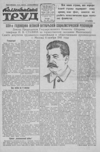Нролетарии всех ст&ан, соединяйтесь'. ТРУД Оргаа Караеукскога V Райкома ВЕЩб) и Районного Совета депутатов трудящихся Алтай ского края выходят 4 раза в иасяи цена номера 13 коп. 13 НОЯБРЯ 1941 Г. Четверг Вся наша страна, все народы нашей страны подпирают нашу армию, наш флот, помогая им разбить захватнические орды немец ких фашистов. (СТАЛИН) ХХ1У-я ГОДОВЩИНА ВЕЛИКОЙ ОКТЯБРЬСКОЙ СОЦИАЛИСТИЧЕСКОЙ РЕВОЛЮЦИИ" Доклад Председателя Государственного Комитета Обороны товарища И. В. СТАЛИНА на торжественном заседании Московского Совета депутатов трудящихся с партийными и общественными организациями г. Москвы 6 ^ноября 1941 года шего года довелось нам про должать нашу мирную, строи тельную работу. Вторая поло вина года, более 4-х месяцев, проходит в обстановке ожесто ченной войны с немецкими империалистами. Война стала таким образом поворотным пунк том в развитии нашей страны за истекший год. Война значи тельно сократила, а в некото рых областях прекратила вовсе нашу мирную строительную ра боту. Она заставила перестроить всю нашу работу на военный лад. Она превратила пашу стра ну в единый и всеоб'емлющий тыл, обслуживающий фронт, обслуживающий нашу Красную Армию, наш Военно-Морской Флот. Период мирного строительст ва кончился. Начался период освободительной войны с немец кими захватчиками. Вполне уместно поэтому по ставить вопрос об итогах войны за вторую половину истекшего года, собственно за четыре с лишним месяца второй полови ны года и о тех задачах, ко торые мы ставим себе в этой освободительной войне. а 4 месяца флота, защищая честь и свобо ду родины, мужественно отби вая атаки озверелого врага, да вая образцы отваги и геройст ва. Но враг не останавливается перед жертвами, он ни на йоту не дорожит кровью моих солдат, он бросает на фронт все новые и новые отряды на смену выбывшим из строя и напрягает все силы, чтобы зах ватить Ленинград и Москву до наступления зимы, ибо он знает, что зима не сулит ему ничего хорошего. За 4 месяца войны мы поте ряли убитыми 350 тысяч и пропавшими без вести 378 ты сяч человек, а раненых имеем 1 миллион 20 тысяч человек. За тот же период враг потерял убитыми, ранеными и пленны ми более 4 с половиной мил лионов человек. Не может быть сомнения, что в результате 4-х месяцев войны Германия, людские ре зервы которой уже иссякают, — оказалась значительно более ос лабленной, чем Советский Союз, резервы которого только те перь разворачиваются в полном об'еме. Товарищи! Прошло 24 года с тех пор, как победила у нас Октябрь ская социалистическая револю ция и установился в нашей стране советский строй. Мы стоим теперь на пороге следую щего, 25-го года существова ния советского строя. Обычно на торжественных заседаниях в годовщину Ок- ' рьской революции подводятся >ги наших успехов в обла- • ч! мирного строительства за екший год. Мы действитель на змеем возможносте , подво- ? .- ь такие итоги, так как на- ■ ■ успехи в области мирного строительства растут не только из года в год, но из месяца в яц. Что это за успехи и колько они велики, — это естно всем, как друзям, так рагам. [о истекший год является только годом мирного строи- ; ьства. Он является вместе с тем годом войны с немецкими захватчиками, вероломно на- зшими на нашу миролюби- вую страну. Только в течение первых шести месяцев истек- Ход ВОЙНЫ 3 Я уже говорил в одном из своих выступлений в начале в