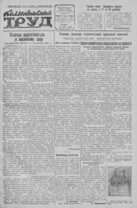 Пролетарии всех стиащ соединяйтесь'. ТРУП Орган Карасукекого ' Райкома ВКЩб) и Районного Совета депутат.в трудящихся Алтайского края Выходит 4 раза в ив&«% цена номера 13 «оп, 26 ДЕКАБРЯ 1У41 г Пятница V м 69 ' 7в0 ^ Трофеи войск Западного фронта за период с 17 по 20 декабря За период от 17 по 20 де кабря войсками Западного фронта захвачено у противни ка: самолетов — 7, танков — 360, орудий — 519, ми ометов — 161, пулеметов — 267, автомашин — 3.059, бронемашин — 28, трак торов-35. Из этого количества в боях на подступах к Воло коламску и. в самом городе зах вачено: танков — 73. орудий — 91, пулеметов — 31, автомашин — 577, бронемашин — 4, трак торов-35. За период с 17 по 20 декабря на Западном фрон те уничтожено 9.090 немецких солдат и офицеров. Совинформбюро Отлично подготовиться к весеннему севу (Из передовой „Правды" за 16 декабря 1941 г.) Усилим помощь героическим красным воинам! Больше дадим для них продуктов питания! В ОКТЯБРЬСКИЕ дни това рищ Сталин призвал колхозни ков и колхозниц к самоотвер женному труду на своих полях, давать фронту и стране все больше и больше продоволь ствия и сельскохозяйственного сырья. Как боевое задание, восприняла колхозная деревня это указание вождя. Быстрее развернулись осенние полевые работы, поднялись темпы по ставок государству зерна, мяса и других продуктов. Увеличи лись 'вклады колхозов и колхоз ников в фонд обороны страны. Одновременно началась подгов- ка к весеннему севу 1942 года. Передовые колхозы и совхо зы изыскивают дополнитель ные источники для увеличения производства продовольствия и сырья. Колхозы и совхозы расширяют посевные площади, намечают и многие уже осу ществляют конкретные меро приятия по повышению уро жайности, что в условиях войны имеет особое значение. Возможности для увеличения посевных площадей в советской стране огромны. Наша родина богата плодородными землями. В военное время местные пар тийные и советские организа ции, земельные органы, все работники сельского хозяйства должны еще более энергично продолжать освоение наших земельных богатств. Надо во всех колхозах без малейшей задержки создать необходимые семенные страхо вые фонды, очистить и отсор тировать семена, тщательно сохранить их. Отличные сорто вые семена — основное условие для получения богатого уро жая. За годы колхозного строя наша страна накопила большой опыт по сбору высоких уро жаев. Выросли новаторы, мас тера социалистического земле делия. 11 если по-настоящему, по-большевистски внедрить этот опыт в колхозное и совхозное производство, кривая наших урожаев резко пойдет вверх. Надо сделать все необходимое, чтобы передовая агротехника стала достоянием каждой бри гады, каждого звена. В этом деле огромную роль призвана сыграть дополнительная опла та труда колхозников за новы Шение урожайности сельскохо зяйственных культур. Многие колхозы и совхозы все еще пренебрегают удобре ниями, теряя из-за этого ты сячи, миллионы пудов зерна,са харной свеклы и других куль тур. Пора положить конец по добному горе хозяйствованию. Удобрения — сильное средство к повышению урожаев. Колхозы и совхозы должны вывезти по санному пути все остатки минерального удобре ния со складов Сельхозснаба Нархомзема СССР, используя их исключительно под важней шие культуры. Надо побольше накопить в колхозах и совхо зах навоза и по санному пути тоже вывезти на поля. Местн