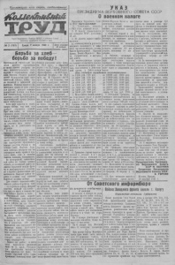 Пролетарий всех стран, соедамлагнесь! Труд Орган Карасукского Райкома ВКП(б) и районного Совета депутатов трудящихся Алтайского края № 2 (763) II Среда 7 января 1942 г. | Цена номера 13 копеек ...... - .■У"Л"1"Л Борьба за хлеб- борьба за победу! УКАЗ ПРЕЗИДИУМА ВЕРХОВНОГО СОВЕТА СССР О военном налоге Кровожадный германский фа шизм жестоко просчитался в своих планах разгрома на шего социалистического госу дарства и порабощения совет ских народов. Рухнул разбой ничий гитлеровский план «мол ниеносной войны», война ста да затяжной и гибельной для фашизма. Мощные удары по фа шистским ордам на ряде участ ков фронта, разгром немецко- фашистских полчищ под Моск вой ознаменовали переход ини циативы в руки Красной Армии, окончательный провал фашист ского наступления. Хотя враг измотан и ослаб, однако победа над ним еще требует огромных усилий. Враг еще силен, он взбешен провалом своих планов, он же сток и коварен. Изгнание вра га с нашей советской -земли на чалось, и наша задача-не толь ко очистить свою землю от врата, но и уничтожить его до конца. В огромной по размаху оте чественной войне, когда враг временно захватил ряд наших хлебородных областей, совер шенно исключительное значе ние приобретают продовольст венные ресурсы страны и их основа — -хлеб. Наличие боль ших хлебных ресурсов так же определяет мощь армии и кре пость тыла, как и наличие танков, авиации, боеприпасов. Во всенародной отечествен ной войне не только каждая область, но и каждый район яв ляется серьезной опорий фрон та и непосредственно участву ет в борьбе с фашистскими зах ватчиками. Каждый район бо рется и должен еще сильнее бороться за нашу победу. Для нашего сельскохозяйст венного района борьба за хлеб — это борьба за победу- Каждый центнер, каждый пуд хлеба — это удар по врагу и помощь на шим бойцам фронта и тыла. Нерушимый долг, первей шая обязанность всех колхозов и колхозников, всех больше виков района — во что бы то пи стадо обеспечить успешное разрешение важнейшей госу дарственной задачи — добиться быстрейшего выполнения пла на сдачи хлеба государству. Пятнадцать колхозов района, находясь в тех же условиях, что и остальные, уже давно выполнили или завершают вы полнение плана хлебосдачи. Это еще раз подчеркивает пол ную возможность для всех кол хозов района своевременно вы полнить свои обязательства перед государством. Однако по району в целом план хлебосдачи выполнен лишь на 71 проц. Результа том преступных методов ра боты является тот факт, что колхоз «Красный путь» (пред- правденид Зелвнков) план хлв- босдачи выполнил всего лишь на 38,2 проц., а «Красный колос» — на 35,2 проц., колхоз «Восход зари» —на 42,2 проц., «Краснофлотец» —на 40,6 проц. «Красный Октябрь» —на 46,5 проц. им. М. Горького — на 56 проц. Все эти колхозы, так позорно и преступно затянув шие хлебосдачу, имеют огром ное количество ещенеобмолочен ного хлеба. В военное время такое положение является вдвой не нетерпимыми позорным. Необходимо мобилизовать все силы и средства на выпол нение боевой задачи — вывоз ки зерна государству и на завершение обмолота. Для вы возки хлеба надо мобилизовать всю тягловую силу, весь тран спорт колхозов, организовать ряд красных обозов с хлебом на элеватор. Суровая военная обстановка требует неуклонной и настой чивой борьбы за хлеб. Мы должны бороться за каждый килограмм,, за. каждый пуд х