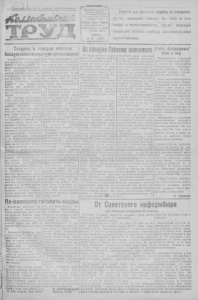 üi-if.PX fffjlpiiHi., Орган Карасукского \j Райкома ВКЩб) . и Районного Совета депутатов трудящихся Алтайского края Выходит 2 раза 8 неделю цена номера 13 .-.он. 31 ЯНВАРЯ 1912 г. Суббвта *,. Л? 6 <767) т. -- у ______ - Никто не должен стоять в стороне, пусть каждый делает то, что в его силах и возможностях, пусть каждый помогает ковать победу над немецкими захватчиками. в» ютпгаш ю егаяяждав Создать в каждом колхозе боевую комсомольскую организацию На пленуме Райкома комсомола Ленинско-сталинский комсо мол пользуется огромным ува жением и любовью нашей со ветской молодежи. Велико стрем ление передовых юношей п девушек вступить в ряды Крас нознаменного Ленинского Со юза Молодежи. Но это благо родное стремление молодых патриотов еще нередко нс находит себе должного со действия со стороны комсомоль цев и комсомольских руково дителей. В с. Хорошем, где па терри тории сельсовета расположено 8 колхозов, работает, к стыду райкома комсомола, только лишь одна колхозная комсо мольская организация — в кол хозе имени Сталина. 11 это в то время, когда в колхозе им. Андреева 5 юношей еще осенью подали заявления с просьбой о принятии их в ком сомол бывшему секретарю ком сомольской организации Д зтобен- ко, развалившему комсомоль скую организацию колхоза. А ‘ из колхоза им. Степана Ра зина к комсомольской органи зации школы недавно приходи ла целая делегация колхозной молодежи с -просьбой помочь, вступить л комсомол и создать в колхозе комсомольскую орга низацию. Напрашивается воп рос: неужели нельзя прикре пить лучших комсомольцев к колхозу им. Степана Разина и ко всем другим колхозам, что бы организовать в них комсо мольские организации? И по чему райком комсомола не за нимается этим важнейшим де лом? Так, вплоть до последнего времени в с. Хорошем работа ла член райкома комсомола т. Арзубова, которая, однако, считала излишним заниматься организацией первичных ком По-военному готовить кадры Подготовка колхозных кад ров в период отечественной Войны приобретает особо важ ное значение. Колхозы долж ны усиленно готовить новых колхозных специалистов, ис пользуя курсы при МТС и межрайонную колхозную щко- ЛУ- Разнарядка КрайЗО по под готовке кадров в этой школе выполнена полностью .только лишь на курсах счетоводов. А на курсы агротехников колхозы Должны были по разнарядке направить 19 человек, но при было только 2 человека. Для Учебы на техников-животново- Дов должно быть направлено 30 человек, но прибыло пока лишь Два человека. РайЗО еще в начале января разослал колхозам разнарядки об отправке людей на учебу, ВО в школу прибыло вместо «2 товарищей только 6 человек, такие вопиющие факты — ре зультат безответственного от ношения колхозных руководи телей к этому важнейшему де- Л У- Так, колхозы «Путь Лени на», им. Карла Маркса, им. Коминтерна, «Красноармеец», им. Свердлова, Хорошевского сельсовета, не выслали в шко лу пи одного человека вместо 2 человек от колхоза. . Безответственность в деле выделения людей на учебу при водит также к фактам само вольного ухода, дезертирства с учебы. Например, после 2 с лишним месяцев учебы ушли с курсов счетоводов Степанова и Терн л якова. В военное вре мя подобное дезертирство не должно проходить безнаказанно. Некоторые руководители, как предколхозов «Кдаспоармеец» и «Краснофлотец», крайне пло хо и нерегулярно снабжают курсантов школы продуктами пи