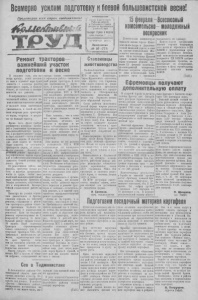 Всемерно усилим подготовку к боевой большевистской весне! Пролетарии всех стран, соединяйтесь! Ремонт тракторов — важнейший участок подготовки к весне В текущем году, как ни когда прежде, успех весенне го сева в огромной мере будет зависеть ст качества работы тракторного парка, а следова тельно, от качества и своевре менности его ремонта. В напряженных условиях оте чественной войны, когда в на ших колхозах количество людей и тягловой силы значительно уменьшилось, в такой же сте пени возросла роль тракторно го парка, возросла и нагруз ка на каждый трактор. Кроме того, фронт требует расширения посевных площа дей и увеличения производства сельскохозяйственпых продук тов. А раз фронт требует — долж но быть сделано! — таков лозунг советского народа. И выполне ние этой задачи во многом будет зависеть от состояния тракторного парка, от качест ва его ремонта. Поэтому об разцовый ремонт тракторов — государственная задача огром ной хозяйственно-политической важности, боевой участок тру дового фронта. От ремонтников сейчас, как никогда, требуется боевая ра бота и высокая организован ность в труде, чтобы весь наличный машинно-тракторный Парк своевременно привести в боевую готовность, подготовить его к напряженной, беспере бойной стахановской работе на севе. Несмотря на успехи отдель ных ремонтников и бригад, главным образом, на текущем ремонте, — положение с ремон том тракторов в районе остает ся тревожным. Особенно не благополучно с капитальным ремонтом. Если по текущему ремонту отремонтировано на 1 февраля! 41 трактор, то капи тальный ремонт прошли только 30 машин. Парк колесных тракторов отремонтирован только наполовину. Айз 9 гу сеничных тракторов ЧТЗ — 60, требующих капитального ре монта, отремонтирован толь ко один трактор, тогда как по текущему ремонту это го вида машин план почти полностью выполнен. Факты говорят, что руково дители МТС в погоне за общи ми цифрами, «откладывают на Сев в Таджикистане В большинстве районов Ста- линабадской области идет сев яровых зерновых культур. По всеместно началась тракторная пахота под хлопок. В колхозе «Дагана» — Кинкского района, своевременно мобилизовав на цахоту и сев живое тдгдо, вы завтра» самую ответственную и серьезную работу — капиталь ный ремонт тракторов. II хотя уже приближается 1 марта — срок, к которому МТС должны завершить ремонт тракторов, — руководители МТС и МТМ еще не добились решительного перелома в ходе ремонтных ра бот в сторону всемерного уси ления капитального ремонта тракторов, одновременно сох раняя и увеличивая темпы те кущего ремонта. Надо помнить, что в воен ное время пасовать перед трудностями, объяснять все неудачи и провалы в ре монте «об'ективными причина ми»— значит обрекать на про вал успех весеннего сева и делать преступление перед го сударством. Еще далеко не все резервы и возможности МТС и МТМ мобилизовали для проведения ремонта. Из множества имею щихся в МТС выбракованных деталей, запчастей и материалов значительная часть путем ре ставрации может быть пущена вход. Необходимо мобилизовать творческую инициативу рабо чих и специалистов па полней шее использование всех собст венных ресурсов. Надо мобилизовать и органи зовать все силы, все возмож ности, чтобы добиться серьез ного перелома в ремонте трак-/ торов и особенно — в капиталь ном ремонте, и в 