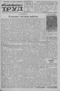 Пролетарии всех стран, соединяйтесь' ^р^ажимие аеяяяе <----- Орган Караеукского Райкома ВКП(б) и Районного Совета депутатов трудящихся Алтайского края Выходит 2 раза в неделю цена номера 7 поп. И МАРТА 1942 г. Среда „Теперь судьба войны будет решаться не таким привходящим моментом, как момент внезапности, а постоянно дей ствующими фактами: прочность тыла, моральный дух армии, количество и качество дивизий, вооружение армии, организаторские способности начальст вующего состава армии". . (Из приказа товарища СТАЛИНА) М. КАЛИНИН Все для фронта Перед деревней стоят ответ ственные государственные зада чи. Приближается весна, насту пает страдная пора — начало сельскохозяйственных работ. Если оценивать сейчас, в 1942 году, на девятом месяце войны, разного вида работы в вашей стране, то весенние полевые работы можно поставить как первоочередные. С ними может быть сопоставлено толь ко производство боеприпасов, вооружения. Но, поскольку сельскохозяйственные работы в своей подавляющей части па дают на колхозников и не про тивопоставляются работе про мышленности, тем самым кол хозники и колхозницы стали как бы на передовые позиции фронта. Прорыв в сельскохо зяйственных работах имел бы не менее вредные последствия, чем неудача на том или ином участке военного фронта. Иаша страна с напряжением всех сил борется за победу, и каждое утро миллионы совет ских людей от фронта до Вла дивостока пристально читают или внимательно слушают по радио сообщения Советского информбюро, радостно находя в них новые успехи Красной Армии. Так вот важнейшим элементом в достижении этих успехов является удовлетвори тельное питание бойцов и ко мандиров Красной Армии. Раз меры нашей армии должны со ответствовать достижению пос тавленной перед ней цели, т. е. разбить фашистскую армию. Следовательно, размеры нашей армии должны быть очень и очень внушительными. Армия должна быть хорошо экипирована и в достаточной сте пени снабжена вооружением и боеприпасами. Эти предметы изготовляют на фабриках и за водах миллионы советских лю дей. Но, чтобы армия хорошо Дралась, а рабочие бесперебой но снабжали ее вооружением и боеприпасами, необходимо обес печить армию и города пита нием: хлебом, мясом, овощами. Люди па фронте должны пи- Та ться сытно, разнообразно, ибо окопная жизнь, постоян ная опасность быть перехит ренным врагом требуют, чтобы организм бойца был в непре рывном напряжении, был жиз недеятелен. Из этого простого рассуждения можно видеть, какое значение имеет хлеб в Достижении наших военных побед и как велика ответствен ность людей, работающих в сельском хозяйстве. Сельскохозяйственные рабо ты имеют свои особенности. При рода определяет порядок по левых работ во времени. Для весенних работ, как сев, посад ка овощей, в каждой местности время отводится довольно ко роткое. Можно считать установ- енным правилом, что весенне- елевые работы должны быть ‘ роидведены в максимально ко О несение - полевых работах роткие сроки. Каждый опоздав ший с работой, вследствие своей беспечности или нерас оряди тельности, рискует за нее ни чего не получить или получить очень мало, рискует урожаем и делает не вполне обеспеченным выполнение своих обязанностей перед государством, перед на родом. II вот если такой рас порядитель — будь это предсе датель колхоза, директор МТС, совхоза, председа