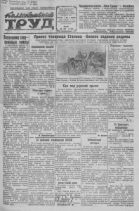 ‘ "сква Арлимс ’ кий пер., *8 Всеср« книжнойп алате (4 «кз) пролетарии всех стран, соединяйтесь ' Орган Карасукского Райкома ВКП(б) и Районного Совета депутатов трудящихся Алтайского края Выходит 1 раз в неделю цена номера 13 son, 13 ЛАЯ 1942 г. М* < 785 >Л Председателю колхоза „Жана-Турмыс “ т. Жаксубаеву Райком ВКП(б) и Райисполком приветствуют колхозников и колхозниц Вашего колхоза за успешное окончание сева зерновых культур. За успешное проведение сева зерн овых культур заносим колхоз «-Жана - Турмыс “ и его председателя тов. Жаксубаева на Районную доску почета и пред ставляем для занесения на Краевую доску почета. Райком ВКП(б) и Райисполком выражают твер дую уверенность, что колхозники и колхозницы Ва шей артели весенне-летние полевые работы прове дут по-военному. Секретарь Райкома ВКП(б) — ЗОЛОТОВ. Председатель Райисполкома — ЧЕНЦОВ . Весеннему севу — военные темпы Приказ товарища Сталина — боевое задание родины СЖАТЫМИ СРОКАМИ СЕВА ЗАВОЮЕМ ВЫСОКИЙ УРОЖАЙ, ПОМОЖЕМ КРАСНОЙ АРМИИ СДЕЛАТЬ 1942 ГОД ГОДОМ ОКОНЧАТЕЛЬНОГО РАЗГРОМА НЕМЕЦКИХ ОККУПАНТОВ В первомайском приказе На родного Комиссара Обороны то варища Сталина Красная Ар мия и весь многомиллионный советский парод получили но вое боевое задание — «добиться того, чтобы 1942 год стал го дом окончательного разгрома немецко-фашистских войск и . освобождения Советской земли от гитлеровских мерзавцев». Эти слова великого полко водца вооруженных сил совет ского народа зовут к упорной борьбе и к скорейшей победе. Они вдохновляют всех совет ских людей на беззаветный ге роизм в ожесточенных боях с врагом и к новым трудовым подвигам на трудовом фронте. Сегодня в нашей газете мы помещаем приветственную те леграмму Райкома ВКП(б) и Райисполкома к колхозникам сельхозартели < Жана Турмыс» З а образцовое и досрочное вы полнение плана посева зерно вых. Мы имеем десятки пере довиков Сталинского похода за лучшую помощь фронту,которые самоотверженно, своим честным трудом куют победу над вра гом человечества. Такие патриоты колхозных полей, как Ольга Кануннико ва-трактористка колхоза им. Молотова, Гордей Клещевский — тракторист Хорошевской МТС, Ольга Цыганенко-колхозница сельхозартели «Интернационал» и многие другие за самоотвер женный стахановский труд Представлены для занесения па Краевую доску почета. Однако в целом по району, Хо Д весенне-полевых работ и Дет крайне-низкими, позорны- Ми темпами. В колхозах «Крас ный боец» — председатель тов Кураев, «Веселый труд» — Еро- Хин , им. Максима Горького и ДР- руководители до сих пор пв включили полностью инвен- тарь и тягло в весенний сев. Зачастую . половина нали чия тягла и инвентаря проста ивает, нормы, как правило, здесь не выполняются. Отвратительно-плохо рабо тает тракторный парк. МТС. Ди ректора и главные механики йе обеспечили боевой готовно сти тракторов для решения за дачи весеннего сева и непред- принимают по существу ника ких мер к тому, чтобы улуч шить работу тракторного парка. Преступление перед родиной Делает тот, кто не дооценивает значение сева, кто работает по-старинке. Такие люди в на ше время должны рассматри ваться, как дезертиры на фронте ’ ’ РУДа, их необходимо строго наказывать. Партийным, комсомольским организациям следует уделить огромное внимание раз'яснению риказа товарища Сталина ‘ РУДящимся массами и на основе требова