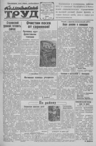 Пролетарии всех стран, соединяйтесь! Орган Карасукского Райкома ВКП(б) и Районного Совета депутатов трудящихся Алтайского края Выходит 1 раз в неделю цена номера 13 коп, )0 ИЮНЯ 1942 г. Среда Колхозники и колхозницы, рабочие МТС и совхозов! Включайтесь в Всесо юзное социалистическое соревнование за высокий урожай! Дадим фронту и стране больше хлеба, мяса и сырья для промышленности. Сталинский урожай готовить сейчас Великая историческая задача, поставленная товарищем Стали ным, — задача разгрома фашист ских захватчиков в 1942 году, — вдохновляет весь наш народ на еще более упорную борьбу, подымает патриотов на новые боевые и трудовые подвиги. Высочайший патриотический под ‘ ем, охвативший наш народ в ответ на первомайский при каз вождя, выразился в небы валом размахе социалистическо го соревнования работников всех отраслей труда, борющихся за перевыполнение государст венных планов, за лучшую по мощь фронту. С пламенным патриотичес ким призывом — организовать Всесоюзное соревнование за вы сокий Сталинский урожай — вы ступили колхозники сельхозар тели «Путь крестьянина», Ново сибирской области. Сейчас нет выше долга, нет выше чести у колхозного крестьян ства, чем завоевать в победо носном 1942 году небывалый, Сталинский урожай и без по терь, во-время убрать его. Все предпосылки для этого есть Надо лишь трудиться как подобает патриотам, борцам за освобож дение своей родины, своих братьев от лютого врага. В борьбе за урожай нельзя терять ни дня, ни часа. В этом году нашим полям, как никог да, необходимы забота и уход, ибо угрожает /исключитель ная опасность их засорения. Прополка и междурядная обра ботка посевов — вот боевая зада ча дня в борьбе за урожай. Всякая недооценка этой задачи является преступлением. В прополке и междурядной обработке не менее чем и в севе, необходима своевремен ность ее проведения. Прополоть во время и тщательно — значит . сберечь многие центнеры уро жая на каждом гектаре. Необ ходимо создавать в каждом кол хозе прополочные звенья,прив лекая в них всех трудоспособ ных, в том числе всех подрост ков и школьников. За звеньями надо закреплять участки и не пропускать ни одного дня, ни одного часа в начале и в ходе прополочных работ. Правильно оценили важность своевременной прополки в кол хозах Черно-Курьинского сель совета. Колхозники сельхозар тели «Интернационал» уже пропололи около 500 га зер новых. В работе активно участвуют учащиеся. Колхозы Черно-Курьинского сельсовета обязались к 12 июня закончить прополку всех культур. Дружно приступают к прополке и в колхозах «2 пятилетка» и «Чернова Полтавщина». Задача всех работников сель ского хозяйства включиться в Всесоюзное социалистическое соревнование и завоевать не бывалый урожай в нынешнем Победоносном году. Очистим посев от сорняк ов! Прополка идет фронтовыми темпами Поддерживая замечательную инициативу колхозников сель хозартели «Путь крестьянина» Новосибирской области о вклю чении в Всесоюзное социалист ческое соревнование в борьбе з а высокий урожай, колхозники артели «Интернационал», по фронтовому организовали про полку зерновых и технических культур. В колхозе организованы спе циальные прополочные звенья, закреплены участки работы. Активное участие принимает учащаяся молодежь. Под руко водством учителей она повсед невно работает на колхоз ных п
