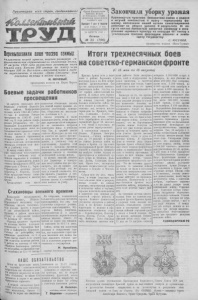 Пролет арии всех стран, соединяйтесь! ТРУД Орган Карасукского Райкома ВКП(б) и Районного 1 Совета депутатов трудящихся Алтайского края Выходит 1 раз в неделю цена номера 13 son, 28 АВГУСТА 1942 г Пятница Закончили уборку урожая Проникнутые чувством беззаветной любви к родине и жгучей ненавистью к врагу — германскому фа шизму, нолхознини нашей артели самоотверженно работают на уборке урожая В результате 26 ав густа колхоз полностью закончил косовицу и скир давание зерновых культур на площади 421 гектар и усиленными темпами форсируем обмолот и хлебо сдачу государству. С. ЮСУПОВ, председатель колхоза «Жана-Турмыс» Перевыполняй план "посева озимых Колхозники нашей артели, широко развернув со циалистическое соревнование на колхозных полях, 27 августа 1942 года полностью закончили посев озимой ржи. Вместо 200 гектар по плачу на ин посеяно 350 га. Все плуги с тягловой силой и людь ми переключены в колхоз «Путь Сталина» для оказания помощи в посеве озимых. И. МОЧЕНЫЙ, председатель колхоза им. Карла Маркса Боевые задачи работников просвещения Итоги трехмесячных боев на советско-германском фронте (С 15 мая по 15 августа) 26 августа проходила кон ференция учителей Карасук ского района. Конференция подвела итоги 1941-42 учебно го года и наметила боевую программу на 1942 43 учеб ный год. В ходе работы конфе ренции установлено, что по давляющее большинство дирек торов и заведующих школ по- большевистски правильно поня ли свои задачи и в период летних каникул принимали активное участие в оказании помощи колхозам, одновременно Деятельно готовили свои шко лы к учебному году. К числу таких школ, кото рые полностью подготовились к новому учебному году и заняли первенство в социали стическом соревновании, можно отнести Кукаринскую НСШ, где Директором т. Попов А., Черно- Курьинскую среднюю школу (директор т. Формов), Углов- скую начальную школу (заве дующий т. Кошелев) и многие Другие. Руководители этих школ Стахановцы военного времени ( Колхозники сельхозартели «Жана - Турмыс», Шилово- Курьинского сельсовета, горя Желанием оказать максималь ную помощь фронту и стране в Дни отечественной войны, Первыми в районе закончили Уборку и скирдование хлебов На площади 421 гектар, Образцы трудового героизма На косовице хлебов показали; Пемсомолец т. Серсембаев Кай- Рула и Байгаринов Нурмикан. Работая на лобогрейке, они ежедневно скашивали по 6 и более гектар вместо 4 по норме при отличном качестве работы. " работе не отставал от них и Абылгаза Бехтемаров, работая на лобогрейке, он ежедневно так- 586 скашивал по 5,5 — 6 гектар, НАШЕ ОБЯЗАТЕЛЬСТВО Встав на фронтовую вахту, На партийно - комсомольском с °браниимы мы обязались дове- Дневную выработку на ком- ° а йн «Сталинец» не менее 150 Процентов к норме и не иметь |1е Рераехода горючего. В первую пятидневку фрон- °пой вахты мы свое обязатель- г ' й ° выполнили, Вместо 17 екта Р по норме мы ежедневно полностью обеспечили школы на зимний период дровами, об разцово подготовили помеще ния, оборудовав их наглядны ми пособиями и т. д. Однако вскрыты и такие вопиющие факты, когда некото рые директоры школ совершен но не занимались вопросом подготовки школ к учебному году. Так, в средней школе совхоза «Культура» до сих пор не имеется ни одного кубомет ра дров, шкода не отремонти рована, к учебному году не подготовлена. Директор этой школы т. Баталова - про