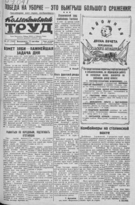 м 2, (; z / / ПОБЕДА НА УБОРКЕ - ЭТО ВЫИГРЫШ БОЛЬШОГО СРАЖЕНИЯ! Пролетарии всех стран, соединяйтесь! *Т£УЧГТТ ШИМЫ^ 1 ИИЩц 1 11 1 Н1 1 ГМ Ь !1, | 1Н111 | И11*. | Н | !.'Ш' '^«И^ЮМ.и 1 ТА | 1УТ!ПЖПИГП вя Я1 Орга« Карасукского РаИкома ВКП(б) и РаИонпого Совета депутатов трудящихся Алтайского края № 37 (7Р6?/И Воскресенье, 13 сентября II Ч ена номера 1942 Г I копеек ВЗМЕТ ЗЯБИ — ВАЖНЕЙШАЯ ЗАДАЧА ДНЯ Заготовка земель под посев *943 года приобретает исклю чительно важное значение в Деле борьбы за высокий уро жай. Однако, до сих пор многие Руководители колхозов не хотят понять той важности, какую Приобретает вопрос взмета зяби. Райком партии и Райис полком в своем постановлении ‘ Об организации работ по помету зяби» решительно осу- Лили такую недопустимую мед лительность и потребовали от всех руководителей колхозов Помедли ни одного дня вклю чить все имеющиеся плуги в колхозе, широко использовав 8 качестве тягловой силы не только лошадей и крупный ро слый скот колхозов, но и ко- Р°в колхозников. Несмотря на серьезные пре дупреждения Райкома и Рай исполкома, на сегодняшний День ход взмета зяби по району и Дет крайне не удовлетвори тельными темпами. Нетерпимую медлительность Допускают колхозы Китай-Го- родского сельсовета (председа тель и также секретарь (парт организации т. Шовкопляс). Здесь тягловой силой до сих Пор к взмету зяби не присту пали. Крупный рогатый скот, к ак с колхозных ферм, а так- ® е и коровы колхозников в РАВНЯТЬСЯ ПО ПЕРЕДОВЫМ, ПОДТЯГИВАТЬ ОТСТАЮЩИХ Одно горячее желание владеет колхозниками нашего района — быстрее завершить Уборку, собрать для страны и Фронта возможно больше хлеба. 30 колхозов района уже за кончили косовицу зерновых. Добиться этого помогло им Умелое использование убороч ных машин и правильная орга низация труда на уборке. Гак, в колхозе «Первое мая» лобогрейками скошено 769 г ектар, весь этот хлеб колхоз ники полностью обмолотили и с Успехом проводят хлебосдачу г °еударству. Выполнив одно- пременно план сева озимых и под'ема паров, колхозники сельхозартели «Первое мая» выразили желание оказать то варищескую помощь отстающим соседям. Бригада колхоза «Пер вое мая» во главе с пред, правления т. Пгашевым, в сос таве 6 лобогреек и 8 подвод, помогает колхозу им. Кирова пыстрее провести уборку. Серьезную помощь соседним колхозам оказывает также кеЛ- °з имени Карла Маркса, где м ₽едправления — коммунист т. Моченый. В этом колхозе за- косовица зерновых Ч» Iработу не включены. Товарищ Шовкопляс, как председатель сельсовета, не потребовал от руководителей колхозов немед ленного включения всех плу гов и необходимого количества тягла на вспашку зяби, а на оборот сам проявил нетерпи мую беспечность и благодушие в деле безусловного выполне ния указаний Райкома и Рай исполкома. Видимо недооценивают вспаш ку зяби и директора машинно- тракторных станций. Трактор ный парк систематически про стаивает, а те трактора, кото рые днем заняты на букси ровке комбайнов, на ночных работах не используются. Осо бенно в этом отличается Бе ленская машинно-тракторная станция (директор т. Захаров). 10 сентября бюроРК ВКП(б) заслушало ряд руководителей колхозов Китай-Городского сель совета о ходе выполнения по становления бюро Райкома и Райисполкома от 2 сентября и потребовало от всех руководи телей колхозов, секретарей парторганизаций, директоров МТС и совхозов решитель 
