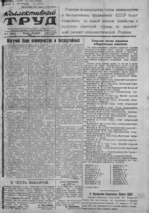 2. .Коллек тивный т р у д- 10 января 1946 г. М* 3 (Мб) Обращение Первого окружного предвыборного совещания ко всем избирателям Купинского избирательного округа № 225 по выборам в Совет Союза Верховного Совета СССР Д о р о г и е т оварищ и ! Восемь лет прешло с те х по р , к а к мм с Вами и «бирали В ерховный Совет СССР первог о созыва, За эги восемь лет мы пережили немало и радостных и г р о з н ы х событий, В эти годы мы завершили величественный план второй п я ти ле т ки и пр исту п или к осуществлению третьей Сталинской п я т и л е т к и . В эти же г о д ы наш мирный созида тельный тр у д был подло наруш е н вероломным нападением немецко-фашистских разбойник о в . Но советское государство с честью вышло из тяжелейших испытаний. Избранники народа, во глаЕв с первым нашим депутатом товарищем Сталиным, твердо вели и привели страну к победе. Героическая Красная Армия, руководимая товарищей Сталиным, величайшим полководцем мира, наголову разбила г и т л е р о в с ки х бандитов на западе и я п о н с к и х империалистов на востоке. Наступила пора мирного развития. Страна залечивает раны, нанесенные войной и требует от всех св оих сыаов и дочерей гор яч е г о уч астия в социалистическом строительстве. От вас, к о л х о з н и к о в и кол хо зниц, р а б о ч и х и работниц МТС и совхозов, и нж енеров и т е х н и к о в , специалистов сельск о г о хозяйства и советской интеллигенции районов К у л у н - и ин с к о г о избирательного о к р у га мы заслушали сообщения в аш и х представителей о состоявшихся решениях по выдвижению кандидатов в депутаты Верховно го Совета СССР. Посоветовались, договорились и единодушно решила первым кандидатом в д епутата Верховно го Совета СССР выставить товарища СТАЛИНА Иосифа Виссарионовича, Ему, великому вождю и учителю, о ш у и д р у г у , гениальному полковод-| цу приносим слова благодарности и преданности, п о ж е л а ния ж и ть и здрзветвовать многие годы для блага нашей Р о дины и всего человечества. Мы поддерживаем Ваши решения о выставлении товарища СТАЛИНА первым всенародным кандидатом в депутаты Верховно го Совета СССР и, выполняя Вашу велю, обращаемся к товарищу СТАЛИНУ с просьбой дать свое согласие баллотироваться по нашему и зби ра тел ь ному о к р у г у . Та кж е единодушно мы поддержали ваши решения о выставлении кандидатами в д е п у таты Верховно го Совета СССР в е р н ы х с оратников товарища С Т АЛИ НА— товарища М АЛЕН КОВА Ге ор ги я Максимилиановича и товарища ВОЗНЕСЕНСКОГО Николая Алексеевича.' Посоветовавшись и до говорив шись и, т а к ж е , выполняя Вашу волю, мы обратились с просьбой к то ва р и щ у МАЛЕНКОВУ ждет вы - j и товарищу ВОЗНЕСЕНСКОМУ баллотироваться избирательному динской сте ои, она » с - , е о к в х и у с то й ч и вы х урожаев, «дать согласие большой агроте хнической к у л ь - j по нашему т у р ы в полеводстве, п о д ' е м а ' о к р у г у , всего Вашего хозяйств а на н о - } Всесторонне, та кж е , мы обсу- вую в ы сш ую с т у п е н ь . О вы- ждали многочисленные решеполнении э т и х задач мы дали свое обязательство. Т еп ер ь это обязательство надо подкреп и ть делом. Скоро— 1 0 февраля 194 6 г о да мы с В»ми должны будем п р и й т и к избирательным у р в а н и подать свои голоса. Это важнбе государственное дело, это долг к а ж д о г о гр ажданина великой нашей страны. Т оварищ и избиратели! На ни я к ол х о зны х собуаевй, соб раний р а б о ч и х , с л у ж а щ и х и интеллигенции о 