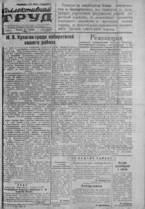 Ш^летарча всех стран, соединяйтесь I 0рга> К а р з с у к с к о г о райкома F K n (6) в р э й о н ж г о Совета ' депутатов т р у д ящ и х с я , Новосибирской области Четверг, 31 января 1946 г. .Цена ном ера I 15 к о п е е к Голосуя за кандидатов блока коммунистов и беспартийных, мы голосуем за д ал ь нейшее укрепление могущества нашей с о ветской державы, за дальнейшее развитие народного хозяйства и к ультуры нашей страны, за значительное повышение ж и зн е н ного ур о вн я с о в е т с к о г о народа. М. В. Кулагин среди избирателей нашего района |ееы> часов * е в е р а и с а р я районный I r j b T j r p u был переп я - 1'Водее 6 0 0 избирателей атра в ближ айши х сел JUC*» сюда на м и ти н г , |щеяный встрече со сво- Ь я д и м т о м в де п у та ты [вного Совета СССР Мвхаи- исвльевичеи К у л а ги н ы м . |т*р г открыл секретарь | v a В Е П ( т ) т о в . Барбабурные аплодисменты в |яый президиум взбарает - флитбюро Ц К В К П ( б ) во с товарищем Сталиным. |н ик м ми тинга устраивают в честь тов арища Сга- Раздаются п р и з е т с тв ен - козгласн : „Да здравствует |ащ С т а л и н ! » ; „ В е л и к о м у 1яу ур а !” ]>вой на тр иб у ну подна- 1я доверенное лицо Октя- 1ого избирательного уча- |тов. Рохммстрова . Б своей loaa с к а з а л а : рротие товарищи! Сегодня - т р у д я щ и х с я К а р а с у к - района— радостный день. |»ш митинг прибыл для 1ч* с избирателями наш ) д а т в д е п у т а т ы Верхов - I С в е т а СССР Михаил В а h * 4 К у л а г и н , (Аплоди стов Рохмистрова, — лично от с е бя, от избирателей Октябрьского избирательного у ч а с т к а , где я я в л яю с ь доверенным лицом, я п р и з ы в а ю вас в день выборов в В е р х о в н ы й Совет СССР— 10 февраля притти к и з б и р а те л ь н ы м урнам и отдать свои голоса за верного сына нашего народа и большевистской п ар т и и — М ихаи л а Васильевича К у л а г и н а . (Б у р н ы е аплодисм е н ты ) . Голосуя з а М ихаила В а с и л ь евича К у л а г и н а , ы * будем голосовать за кандидатов непобедимо го блока коммунистов и беспарт и й н ы х , за нашего любимог) вождя народ в — творца С талинской К о н с т и т у ц и и Иосифа Виссарионовича С т а л и н а . У ч а с т н и к а ми тинга у с т р а и вают бурную овацию в честь товарища Ст а л и н а . Раздаются нр и в е т стве я ны е в о з г л а с ы : „Да здравствует великий Ста- л и в | * , «Великому С т а л и н у — первому всенародному кандид а т у у р а ! » . В ы с т у п а ю т уч ас тн и ки мит и н г а т т . Х и с м а т у л и н , Ал е ксе е в а , Г у с е л е т о в а , Т к а ч е в , Семенков и У к о л о в а , Все она говорят о любви и преданности советскому п р ав и те л ь с тв у , п а р ти и большевиков , великому С т а л ин у Р е з о л ю ц и я а). и за вер яю т , что они ж и зн ь товарища Ку ла - с радостью, единодушно отдадут спои голоса за кандидатов сталинского блока коммунистов и б е с п а р т и й н ы х— за т т . К у л а ги н а и К у р д ю к о в а . Г ор я чо приветствовали у ч а с т ник» ми тинга выступление своего кандида та в депутаты В е р х о в н о го Совета СССР М и х аи л а Ва си ль е в ич а К у л а г и н а , В своей речи то». К у л а г и н принес гл у б о к ую бла годарность всем и зб и р а те л ям , выд- вивувшам его кандидатом в де пу та ты Верховного Совета СС СР , за оказанное ему д верит и заверил избирателей К ар а с у к с к о го района, что он не пожалеет своих с и л , знаний в о п ы т а , чтобы оправдать это довзрие. Далее тов. К у л а г и н говорит, что сейчас наша страна и весь советский народ приступают к осуществлению гран диозвого плана послевоенного восстановления и р азви тия 