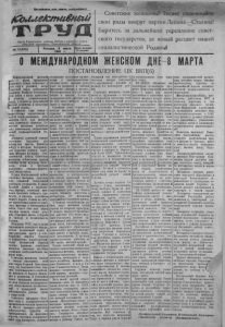 <*£f ri/T-'v ' M < v i t p o n a dQ .L Пролетарии, всея ст р а н , соединяйтесь! Орган Карасукск ого райкома ВКП(б) и районного Совета д е п у та то в тр удящихся , Новосибирской области № 1 3 ( 9 5 8 ) Пя тниц а , 8 м а р т а Ц ена н о м е р а 1 946 г , 13 к о п е е к С о в е т с к и е женщины! Теснее сплачивайте свои ряды во к р у г партии Ленина— Сталина! Б ори тесь з а д ал ьнейш ее укреп л ени е с о в е т ского государства , з а новый р а с ц в е т нашей социалистической Родины! О МЕЖДУНАРОДНОМ ЖЕНСКОМ ДНЕ-8 МАРТА П О С Т А Н О В Л Е Н И Е ЦК В К П ( б ) . . ж е н с ки й ! |вяь— 8 марта трудящиеся [оветского Союза встречают в том г оду в у с л о в и я х , когда !оветский народ победоносно авершил В е л и к ую Отечествен- дую войну и вновь пр и с т у п и л мир ному созидательному груду, к борьбе за дальнейший расцвет хозяй ства и к у л ь т у р ы нашей стране, В тяж елы е годы войны с фашистскими з а х в а т ч и к а м и с особой силой вы я в и л а с ь роль ж енщин СССР , к а к великой силы советского общества . Советские ж е н щ и н ы п о к а з а л и себя пламенными патриотками нашей социалистической Ро - щны. Ж е нщ и ны советской с т р а н ы неутомимо труд ил и сь для победы над врагом, Навсегда войдут в историю беспримерные трудовые подвиги советских же нщ ин в о - в р е м я О те чественной во й ны . Со ветские женщины доблестным трудом помогли своим м у ж ь я м , сы но вьям, отцам и б р а т ь ям ра згроми ть немецко-фашистс к и х з а х в а т ч и к о в , В годы Отечественной войны советская ж е н щ и н а показ ала себя отважной з а щ и т в и ц е й советского государства. В рядах красной А р м и и , в п а р т и з а н ских отрядах советские ж е н щины проявили стойкость, х р а брость и героизм , достойные нашего народа. Родина не забудет г ероически х подвигов советс к и х ж е н щ и н в Отечественной войне. Св я то чтет н а ш народ с ве т л ую п а м я т ь своих дочерей, о т д а вш и х ж и зн ь в борьбе за свободу и не за висимость Родины. Ж е нщ и ны СССР, идя в рядах героического советского народа, внесла неоценимый вклад в Дело р а з г р о м а вр а г а и осво бождения народов Е в р о п ы от фаши стских поработителей. ^в°ей беззаветной борьбой против фашизма с о ветская женщина завоевала всеобщее у важени е свободолюбивых народов мира. Советские ж е н щ и н ы смогли с чес тью вы п ол н и т ь свой Долг перед Родиной благодаря тому, что б о льш евистс кая п а р т и я , советская власть освободи Ли ж е н щ и н от былого беспра вия и у гн ете н ия . В Советском оюае женщинам обеспечены во всех областях го с у д а р с т в е н ной, общественной , хозяй ствен ен и к Ул ь турной жизн и Действительно равные права с м уж ч ин ой . Советская ж е н щ и н а — боль- ®а я сил* в социалистической промышленности и на транспорте. М но го ж е н щ и н— работниц Добросовестно тр уд я тся на Р е д п р и я т и я х , на ж елезных Д р о г ах , неустанно совершенст- Уют свое мастерство, успешно овладевают с л о ж н ы м и профессиями и с пециальностями . Десятки ты с я ч женщин р у к о водят на ф абриках и заводах бригадами, сменами и цехами . Многие женщины стоят во главе фабрик и заводов. Только в пр омышленности работает с в ы ше 2 5 0 ты ся ч женщин инженеров и те хни ко в . Огромную роль и гр аю т советские ж е н щ и н ы во всех отраслях социалистического с е л ь с к о г о хозяйства. Ж е н щ и н ы - к о л х о з н и ц ы , работницы совхозов самоотьерженно т р у дятся на полях и фермах Более 3 5 0 т ы с я ч передовых ж енщин руководят бригадами и живот
