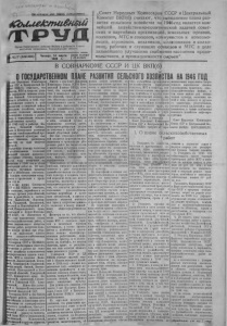 2. „КОЛЛЕКТИВНЫЙ т р у д* 14 марта 1946 г. № 16,17 (959-9601 В СОВНАРКОМЕ СССР И ЦК ВКП(О) ОГОСУДАРСТВЕННОМ ПАЛНЕ РАЗВИТИЯ СЕЛЬСКОГО ХОЗЯЙСТВА НА 1946ГОД ( ПРОДОЛЖЕНИЕ . На ч а л о см. на 1 с тр.) и плодово я г о д н ы х к у л ь т у р , по ко торым у р ож ай н о с т ь настоящим постановлением не у т верждена ; в) у т в е р д и т ь а ла н посадки полетащи тпглх ле с н ы х полос и д р у г и х з а щ и т н ы х л е с н ы х н а саждений, а т а к ж е задания по у х о д у , очистке и ремонту имеющ их ся з а щ и т н ы х насаждений и довести э т и задан ия до районов и к о л хо зо г ; г ) утвердить п л ан по з а к л а д ке и новому строительству парников и теп лиц, улучшению л у г о в и пастбищ ; д) при доведении планов до районов, колхозов и совхозов, обеспечить размещение с е л ь с к о х о з я й с т в е н н ы х к у л ь т у р в полном соответствии с введенными и вводимыми севооборотами и п лав ами перехода к ним, а т а к ж е с учетом необходимости у с тр ан е н и я д а л ь н и х перевозок малотранспортабельной продукции (са харной с в е к л ы , кар тоф еля , овощей). 8 . Совнарком СССР и Ц К облисполкомов, крайисполко- финансовых планов в ко лхс - мов, обкомов и крайкомов пар- з а х , МТС а с о в х о з а х , заклю ч и , совнаркомов республик и | ч е н в е договоров МТС с колхо- Ц К компартий союзных рас- вами, а т а к ж е составление н у б л и к на необходимость своевременного со гласо вания работ ы ме стных органов Нарком- зе^а СССР и Наркомата т е х н и ческих к у л ь т у р СССР по у с т а новлению и выполнению п л а нов сельскохозяйственных ра бот на 1 9 4 6 год по каждому району, МТС и ко л хо зу . Совнарком СССР и Ц К В К П ( б ) у с т а н а в л и в а ю т , что из области, кр а я и автономной республики каждому району, а в районе — каждому ко лхозу должен доводиться единый план р азви тия сельского х о з я й с тв а по всем показателям , предусмотренным государственным планом. Обязать райисполкомы и райкомы п ар тии рассматривать и утверж да ть совместно с директорами соответствующих МТС планы тр ак то р н ы х работ В К П ( б ) обращают внимание МТС по каждому к о л х о з у . II. О подготовке к весеннему севу и организации полевых работ Совнарком СССР и Ц К В К П ( б ) обязали Наркомзем СССР, Наркомат т е х н и ч е с к и х к у л ь т у р СС СР , Наркомсовхозов СС СР , Наркомпищеаром СССР и Наркоммясомоларом С С С Р , местные советские , партийные и земельные о р г а н ы обеспеч и т ь быстрейшее за вершение подготовки к весеннему севу всех колхозов, МТС и с о в х о зов и проведение весеннего сева в л учш ие а г р о т е х н и ч е с кие сроки дл я каждой с ель скохозяй ствен ной к у л ь т у р ы при хорошем ка ч е с тве полев ы х р аб о т , В э т и х ц е л я х : 1. Полностью и доброкачественно отремонтировать все т р а к то р ы и тр ак торный инвентарь в каждой МТС и совх о з е , а т а к ж е к о н н ы й инвент а р ь , тр ан с п о р т и у п р я ж ь в каждом к о л х о з е и совхозе. О к а з а т ь помощь МТ<\ ко лх о з а м , со вхозам в проведении ремонта т р а к т о р о в , сель с к о х о з я й с т в е н н ы х машин и орудий путем посылки из г о родов ремонтны х б ри гад , в ы делением з а п а с н ы х ч а с т е й , металла , т о п л и в а , ремонтных материалов , инструм ен та и обор удо ван ия , а т а к ж е проведением ремо н тны х работ, в особенности ремонта моторов к трак торам и комбайнам и и з г о товления з а п а с н ы х частей на п р е д п р и я ти я х . 2 . Обеспечить за в о з горючего в МТС и совхозы до н а ч а ла весенней р а с п у т и ц ы , ' о к а з ы в а я им помощь г