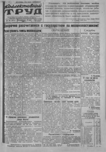 X 2. .К О Л Л Е К Т И В Н Ы Й Т Р У Д ' 27 мая 1946 г. № 34 (977) Четко организовать приемку и переработку молока! Рванйятсеь напередовых агентов Ко л х о з н и к и, хо з яйст ва рабочих и с л у ж а щ и х Б л а г о д а т с к о г о с е л ь с о в е т а , где ра бот ае т а г ентом тов . К у з нецов, с вои о б я з а т е л ь с т в а по мо л о к о п о с т а в к ам на 20 мая выполнили на 20,6 процента. Ко л х о з ник и Осоло- д и нс к о г о с е л ь с о в е т а , где агентом тов . Кра с иль ник ов —более 20 проце н т ов , кол хозники с е л ь х о з а р т е л и „Кра сный боец41 эт ого с е л ь с о в е т а план молокопос т а в о к выполнили на 50 процентов . Однако не все агенты так орг а низ уют р а б о т у . Особенно плохо пос т а в л е н а р а б о т а с р е д и с да т чик ов в Хоро- шинском с е л ь с о в е т е , где аг ент тов . Че рнобай. План мо лок опос т а в ок з де с ь выполнен на 4,7 процента . В Майском с е л ь с о в е т е ( a i e i i T - тов. Лу б а ше в ) план выполнен на 6 процентов, в Кучу- г у р с к ом ( а г е н т тов. Шла- паков) —на 6 процентов и В К а р а е а р т о в е к о м СеЛЬСО-*чин 60 лет, женщин 55 лет), не вете ( аг ент тов. Имтенгенов) имеющих трудоспособных членов v _____ п в семьи, проживающих совместно с план выполнен только на прест’арел11ми; 0, 7 п р о це н т а , | б) хозяйства военнослужащих ряО в о е в р е м е Н Н О б ВЫПОЛНв- j дового, с ержант ског о и старшинУстановить, что хозяйства жителей городов и рабочих поселков привлекаются к обязательной поставке молока государству по половинным нормам сдачи, установленным для хозяйств колхозников данного района. ____ ( Из постановления Совета Министров СССР и ЦК ВКП( б) от 19 марта 1946 г.) Честно выполним свои обязательства Постановлением Совета Министров СССР и ЦК ВКЦ(б) от 19 марта 1946 года пре дус мот ре но обложение молокопоставками рабочих и служащих, п р ожи в а ющих в сельских городах и р а б о чих поселках в половинном р а з мере против установленных норм для сельской местности. Хозяйства, имеющие старых коров, об ла гаются в ра змере 120 литров молодых (первотелок) - Ь0 литров при средней жирности молока , уст ановленной для нашей обла с т и—4,4 процента. Правительство и партия установили большие льг оты для ряда хозяйств. В половинном ра з ме р е к нормам сдачи молокопоставок, установленных для хоз яйств с е л ь ских городов и рабочих поселков, а т акже сельской местности, о б лагаются: а) хоз яйства нетрудоспособных, ввиду преклонного возраста, ( мужние плана молокопост а вок перед г о с у д а р с т в о м —дело б ольшой г ос у д а р с т в е н но й в ажности. Каждый агент ра йуполмин з а г а должен х о р о шо у я с н и т ь себе эту з а л ч а у и орг аниз ова т ь р а б о т у так , чтобы все к о л хозы, колхозники, хоз яйст ва ’ р а б о т а л * * 5 Г 4 » о - * 1 | е д т т г р няли а к т ив ное у ч а с т и е в молокопост а вк ах и ко дню Победы над Я п о н и е й —; с ент ября п о л но с т ь ю рас с чи т а л ис ь с г о с у д а р с т в ом Г, Р а х м а н ь к о В райкоме В К П ( б ) Хорошинский сельсовет один щ к р у п н ы х в нашей районе П л а н молокопоставок по колх о з ам этого сельсовета к районному плану составляет более 10 процентов. Казалось бы, что партийная организация и руководители села должны бы ли принять все необходимые меры к быстрейшей сдаче молока государству . Однако этог о не случилось, Выполнение плана молокопоставок здесь предоставлено полнейшему самотеку. Председатель сельсовета тов. Моченый, секретарь п ар торганизации тов. С у п р у н и руководители колхозов не озн