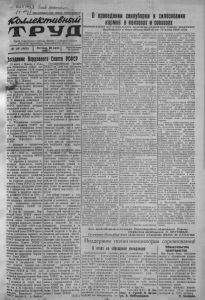 ' Г у * f t j UUA> fc c o b 'A u& +*1& 4£L<_J C ^ * 4 П р о л е т а р и и всея с т р а н , с о е д и н я й т е с ь jC buueJ& nuSH G U i Т Р У Д Орган Карасукского райкома ВКП(б) и районного Совета д епутатов трудящихся , Новосибирской области. № 3 9 ( 9 8 2 ) Пятница, 28 июня 1946 г. Цена н ом ер а 15 копеек Заседание Верховной Совета РСФСР 2 0 июня, в Кремле, в Б о л ь шом Кремлевском дворце состоялось открытие Y II- й сессии Верховного Совета Р СФ С Р . Сессию открыл Председатель Верховного Совета Р С Ф С Р депута т. А . . Л. Жданов. *. Хоа^Жданов произнес речь, памяти М иха ил а ц щ в ж й и ч а Калинина. По предложению т ов. Жданова депута ты В е р х о в н о го Совета Р 1 Ф С Р почтили п а м я т ь М. И. Калинина вставанием Затем В е р х о в ны й Совет РСФСР единогласно утвердил следующий порядок дня: 1. Пятилетний план восстановления и развития народного хозяйства Р С Ф С Р на 1946 — 1950 г г . 2. Утверждение государственного бюджета РСФ СР на 1946 год и утверждение отчета об исполнении государ ственного бюджета Р С Ф С Р за 1 9 4 5 ф д . 3. Утверждение У к а з о в Президиума В ерхо вно го Совета РСФСР. С докладом о пятилетнем плане восстановления и развития народного хозяй ства Р С Ф С Р на 19 46 — 19 50 г г . выступил Председатель Госплана Р С Ф С Р тов. Д. Д. Дегтярь. Н а утреннем и вечернем заседаниях В е рх о в но го Совета РСФСР 21 июня происходило обсуждение доклада о пятилетием плане восстановления и развития народного хозяйства РСФСР н а 1 9 4 6 - 1 9 5 0 годы. На утреннем заседании В е р ховного Совета Р С Ф С Р 22 июня закончилось обсуждение доклада о пятилетнем плане восстановления и р а з в и т и я народного хозяйства Р С Ф С Р на 1946 — 1950 годы, и В е р х о в н ы й Совет заслуш ал заключительное слово докладчика— председателя г осп лава РСФ С Р тов Д. Д. Де гтярь . Ra том же заседании Ховный Совет Р С Ф С Р единогласно утвердил з а к о н о п я т и летнем плане восстановления и развития народного хо зя й ст ва РСФСР на 19 46 — 19 50 годы. После утверждения закона В е р х о в ны й Совет Р С Ф С Р единогласно постановил передать на рассмотрение Совета Министров РСФСР предложения депутатов Верховного Совета Р С Ф С Р о Дополнительных ас си гно ваниях н® капитальное строительство, внесенные ими в сво и х в ы с т у п лениях на заседаниях В е р х о в о г о Совет Р С Ф С Р . Затем В ерховны й Совет пр и к у п и л к обсуждению вто- Р°го вопроса порядка дня — Утверждение государственного бюджета Р С Ф С Р на 1946 год и Утверждение отчета об ис- п°лнеаии государственного бюджета РСФ СР за 1945 год. С Докладом по этому в о п - Р°СУ вы ступил министр финан- °в тов. А. М. Сафронов, с содок аД°м— председатель бюджетной Р о с с и и В ерховно го Совета ЬфСр депутат И, А* Власов. Го с у д а рс т в ен ны й бюджет Р С Ф С Р на 1946 год составлен в сумме 33 миллиарда 201 миллион рублей — н а 2 2 , 6 процент а больше бюджета 1945 года. Эти средства полностью вдут на осуществление плана первого года новой пятилетки. 5 миллиардов 8 3 0 миллионов рублей а с си гную тся на финансирование народного хо- за йства— на два с лишним миллиарда больше, чем в пр ошлом г о д у . Эти средства обеспечат восстановление и ра зв итие ре спубликанской и местной промышленности, промысловой продукции, рост всех видов промышленной продукции, в первую очередь товаров широ кого потребления и продоволь ствия, Один миллиард рублей— значительно больше, чем в предвоенном 1 9 4 0 г . — выделен на ремонт жи лого фонда и благоустройство, на улучшение коммун