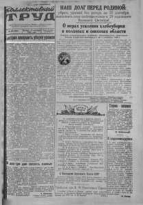 2 , . К О Л Л Е К Т И В Н Ы Й Т Р У Д ' 12 сентября 1946 г. JSI» 50 (9аз В ройясвошме я ройше ВКП(б) Подведеаы и то г и с о ц и а л и с т чеевого соревнования сельских советов, колхозов и к о м байновых а г р е г а т о в йа уб орк е у р о ж а я н а 1 0 сентября 1 9 4 6 года. Райисполком и бюро к о к а В К Щ б ) призвали побе дителем в социалистическом соревновании Ш и лов о -К у рь и н с к п й сельский совет (предсе датель тов. А г е е в , секр етарь п а р т о р г а н и з а ц и и то в. Поно м а р е в ) , колхозы ко торого убрали 6 9 . 6 процента хлеба к п л а н у . Ш и ло в о -Е у р ь и н с к о м у сельскому совету присуждено переходящее кр асное знамя райисполкома и райкома В К Щ б ) . Председателю совета той , А г е е в у и секретарю п а р т о р г а н и з а ц и и тов. П о н о м а р е в у об“ явлена благодарность. Одновременно переходящее кр а с н о е знамя райисполком а и р а й к о м а Б Б П ( б ) присуждено к о л х о з у <1 -е м а я * , Шилово- К у р ь в н с к о г о сельсовета (председатель тов. Ш аб а л а , секрета рь комсомольской о р г а н и з а ции тов, З убц ов с ка я ) , выполн и в ш е м у план хлебоуборки н а 7 9 . 1 п роц ент а . Товарищам Ш а б а л а , Зубцовской и предст авителю райисполкома и ра й ком а В К Щ б ) т . Иванову о б ' я в л е н а благодарность. Второе место в социалистическом соревновании п р и с у ж дено колхозу „ П я т и л е т к а * , Р а с с к а з о в с к о г о сельсовета. Колхоз убрал 7 8 , 7 процента хлебов к п л а н у . Председателю ко л х о за тов, С к р и п н и ч е н к о , секретарю пар т ор ган и зац и и тов. К у л е ш о ву, секретарю комсомольской организа ции тов. Германовой и представителю райисполкома и р ай кома В К П ( б ) тов. Л о г в и н е н ко об“ явлена благодарность. Первое место в социалистическом соревновании среди комбайновых а г р е г а т о в з ан ял комсомольско-молодежный комбайновый а г р е г а т комбайнера К а р а с у к с к о й МТС тов. Кулям - п и н а , убравший комбайном Сталинец» 3 1 0 г е к т а р о в . А г р е г а т у присуждено переходящее красное знамя райисполкома и райкома В К П ( б ) . Тов. К ул ям - п и н у и членам а г р е г а т а об“ -^ явлена благодарность. Райисполком и райком В К Щ б ) отметили, что нетерпимое бла го душие в уборке у р о ж а я про д о л ж а е т проявлять Л е п о к у р о в - ский сельский совет (председатель тов. М е р з л и к и н , с е к р е та ри п а р т и йны х о р г а н и з а ц и й т. Л у к ь я н ч и к , Быльева . Я к у н и н а , Л у к ь я н ч и к Н . и председатели колх озов). Р а й исп ол ко м и райком В К П ( б ) потребовали от них р еш и тел ь ны х мер по усилению уборки уро ж ая и сдачи хлеба го судар ств у . По 5 га на лобогрейку В колхозе «Майское утро» хорошо работают на уборке уро ж ая машинисты М ария Кондратова и Мария Морозова. Они с к аш и в аю т лоб огрейками ежедневно до 5 ге к т а р о в к а ждая. Из плана 4 2 0 гектаров прос тейшими машинами убрали 2 5 0 ге к т а р о в . В этом го д у к о л х о з собирает хороший уро ж а й . П ш е н и ца дает с г е к т а р а 18 цея - Передовые комбайнеры I косовице применяет в ы г р у з - '™ еРов» овес—20 центнеров. Карасукской МТС по-боево-1 ку зерна на ходу. Т. Пра- Особая з я с л т в этом приму ведут уборку у р ож а я в солов убрал у ж е свыше 200 колхозах. Впереди идет ком- ге ктаров. Комбайнер Береж - Соревнов ани е комбайнеров БЫСТРО И ХОРОШО Во 2-й полеводческой бригаде колхоза „Вперед к коммунизму* организовано постоянное звено скир- д овщ и ков . Члены звена М. Гавришева, М. Мыльникова, М. Бутова , Е. Зиновьева и Л. Ч еркасская работают на скирдовании хл еб