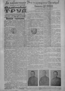 2. .К О Л Л Е К Т И В Н Ы Й Т Р У Д4 7 ноября 19*ы г. № * 6 1 (1004) П р и з ы в ы Ц К В К П ( б) к 29-ой годовщине Великой Окт ябрьс кой Социалистической революции 2 9 . Рабочие и работ ницы , и н ж е н е р ы и т е х н и к и местной промышленно сти и промысловой к оо п е р а ц ии ! Всемерно увеличивай те вып у с к и у л у ч ш а й т е к а ч е с т в о предметов ш и р о к о го п о т р е б л е н и я и д о м а ш н е г о обихода! Ш и ре используйте местные ресурсы! Р а с ш и р я й те производство местных строительных материалов! Ж Советс кие ж е л е з н о д о р о ж н и к и ! Б >рятесь з а б е спер ебо йную р а бо т у т р а н с п о р т а в зимн и х условиях! Своевременно доставляйте г р у зы для н а р о д н о г о хозяйства! У в ел и чи в ай те п о г р у з к у и у с к о р я й т е оборот в аго н ов ! У л у ч ш а й т е о б с л у ж и в а н и е па сс ажи ров ! 3 1 . Р а б о т н и к и м о р с к о го и речного флот а ! Быстрее доставляй те г р у з ы для народного х о з я й с т в а с т р а н ы ! Б ори т е с ь за образцовое проведение з и м н е г о судоремонта ! 3 2 . Р а б о т н и к и советской т о р г о в л и , к о о п е рации и общ е ственного п и т а н и я ! Р а з в е р ты вайте к у л ь т у р н у ю с о в е т с к у ю торговлю в городе и деревне ! У л у ч ш а й т е обслуживание сов ет ско го п о т р е б и т е л я ! 3 3 . К р е с т ь я н е и к р е с т ь я н к и , рабочие МТС и совхозов ! Больше х л еб а , ов ощ ей , м я с а , молока для н а с е л е н и я , больше сырья для п р ом ы ш л ен н о с т и ! 3 4 . Кр е с ть я н е и к р е с т ь я н к и ! Честно я а к к у р а т в о выполняйте свои обязательства перед гос ударс твом ! П е р е вы п ол н я й те план з а г о т о в о к ! Дадим стране бол ьш е х л еб а , масл а , м я с а , овощей! 3 5 . К о л х о з н и к и и к о л х о з н и ц ы ! Всемерно у м н о ж а й т е общ е ственное б о г а т с т в о к о л х о з о в , у к р е п л я й т е д и с ц и п л и н у тр уд а ! Свято соблюдайте У с т а в с ел ьс кохо зяйс твенной а р т е л и — основной з а к о н к о л х о з н о й ж и з н и ! 3 6 . К р е с ть я н е и к р е с т ь я н к и , рабочие и работницы с овхоз ов , з о о т е х н и к и и в е т е р и н а ры! По вы ш айте прод у к ти в н о с ть ж и в о т н о в о д ств а! Добивайтесь з н а ч и т е л ь н о г о прироста п о г о л о в ь я с к о т а ! Дадим с тр а н е больше п р о д у к т о в животноводства! 3 7 . Р а б о т н и к и советской н а у к и ! О б о г а щ а й т е н а у к у и т е х н и к у новыми исследованиями, изобре тениям и и о т кр ы т и ям и ! Обеспечим дальн е й ш и й т е х н и ч е с к и й прогресс во всех о т р а с л я х народ н о го х о з я й с т в а с тр аны ! " 8 , Р а б о т н и к и л и т е р а т у р ы , и с к у с с т в а , ки н ем а т о гр аф и и ! С о ад >в ай г е высокоидейные х уд о ж е с т в е н н ы е прои . ’.ведения, достойные в е л и к о г о советского народи! 3 9 . У ч и т е л я и у ч и т е л ь н и ц ы , р а б о т н ики народного о б р а ы в а н и я ! П о вы ш а й те качество о б у ч ен и я детей! В ^ п и т ы в а й т е образованных и к у л ь т у р н ы х людей, беззаветн о п р е д а н ны х н аш ей О т чи зн е ! 4 0 . Т р у д я щ и е ся Советского Сою за ! О к р у ж и м всенародной заб той инвалидов От ечественной войны и семьи г е р о и ч е с к и х советс к и х воинов, о т д ав ш и х свою ж и з н ь з а свободу и независимос ть н а ш е й Родины! 4 1 . Советские профсоюзы! Ш и р е р а зв е р тывайте социалистич е ское соревнование за выполнение и п е р е вы п о л н ен и е н о в о го п я т и л е т н е г о п л а н а ! П р о я в л я й т е н е у с т а н н у ю з а бот у о повышении материально го и к у л ь т у р н о го у р о в н я ж и з н и т р у д я щ и х с я ! 4 2 . Да здравствуют со в е т с к и е ж е н щ и н ы — а к т и в н ы е у ч а с