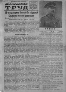„КОЛЛЕКТИВНЫЙ Т Р У Д “ г . 14 ноября 1946 года № ^62-63^Ш 05-100б2 29-ягодовщинаВеликойОктбярськйоСоцаилситичсекойреволюции Д о к л а д А. А. Жданова на торжественном заседании М осковского С о ве т а 6 ноября 1946 года ( П р о д о л ж е н и е . Н а ч а л о см . на 1-й ст ра ни це) Советские люди п р и в ы к л и с т а в и т ь общенародный г о с у д а р с т в е н н ы й интерес п р евы ш е всег о . Они п р и в ы к л и с ч и т а т ь общее дело своим н а с ущ н ы м ли ч н ы м делом . Вот почему сов е т ск ий народ в о с п р и н я л нов ы й п я т и л е т н и й п л а н , к а к боев у ю п р о г р а м м у , о тв е ч аю щ ую е го к р о в н ы м ж и з н е н н ы м и н т е ресам. Пафос с о зи д ат ельно го т р у д а о х в а т и л миллионы людей. По всей с т р а н е развернулось соц и а л и ст и ч е ск о е соревнование з а вы п о л н е н и е и пе ревынод- нени е п я т и л е т н е г о п л а н а . Сов е т с к и е люди в своем у с т р е м л е н и и вперед и з ы с к и в а ю т новы е п у т и и возможности для д а л ь н е й ш е г о под'ема вс ех отр а с л е й народного х о з я й с т в а и к у л ь т у р ы . Д р у ж б а народов С С С Р ,о к р е п ш а я и з а к а л и в ш а я с я в в о е н н ы х и с п ы т а н и я х , я в л я е т с я могу чим средством под'ема и р а с ц в е т а народного х о з я й с т ва и к у л ь т у р ы в м и р н ы х у с л о в и я х . Т о в а р и щ С т а л и н г о в о р и л : „ С о в е т с к и е лю д и во г л а в е с к о м м у н и с ти ч е с к о й п а р т и е й не п о ж а л е ю т сил и т р у д а д л я т о г о , чтобы не т о л ь к о в ы п о л н и т ь , но и п е р е в ы п о л н и т ь нов у ю п я т и л е т к у 11. Т е п е р ь все в и д я т , что э т и в д о хновен н ы е сло ва н аш е го в ож дя с у спехом в о п л о щ а ю т с я в ж и з в ь . Первы е р е з у л ь т а т ы в о с с т а н о в л е н и я н а ш е г о народно го х о з я й с т в а у ж е на лицо . Оживает и з р а н е н н а я вр агом з е м л я , из р у и н п о д н и м а ю т с я в о з р о ж д а е мые з а в о д ы , ф а б р и к и , ш а х т ы , к о л х о з ы , с о в х о з ы , ш к о л ы , в у з ы и н а уч но -ис сл е д ов а т е л ь ск и е у ч р е ж д е н и я . С чувством г л у б о к о го удо в ле т в о р е н и я с тр а н а у з н а е т о во сстановлении и п у с к е в х о д п р е д п р и я т и й , с о з д а н н ы х з а го ды д о в ое н ны х п я т и л е т о к и ныне вновь возрождающ и х с я из п е п л а и р а з в а л и н . Снова в с т у п и л и в строй д е й с т в у ю щ и х п р е д п р и я т и й С т а л и н г р а д с к и й и Х а р ь к о в с к и й т р а к т о р в ы е з а в о д ы , Р о с т о в с к и й з а вод с е л ь е к о х о з я й с т в е н н ы х маш и н , Н и ж н е - С в и р с к а я гидроэ л е к т р о с т а н ц и я , Беломорско- Б а л т и й с к и й к а н а л и многие д р у г и е к р у п н е й ш и е п р е д п р и я т и я . П о д н им а е т с я на ноги мет а л л у р г и я Ю г а . В в е д е н ы в д е й с т в и е домны на К о н с т а н т и - новском , М акеев ском заводах и на заводе и м . Д з е р ж и н с ко го . Б л и з и т с я срок п у с к а в о с с т а н а в ливаемого Д н е п р о г э с а . Донбасс, совершенно р а з р у ш е н н ы й н е м ц а м и , ув еренно иде т по п у т и восстановления довоенного у р о в н я добычи у г л я . Во зр ож д ен и е э т и х п р е д п р и я т и й п р и в е т с т в у е т народ, почти к а к воск решение из м е р т в ы х , т а к к а к з н а е т , до к а к и х пределов р а з р у ш е н и я они б ы л и доведены ф а ш и с т с к и ми и з в е р г а м и и к а к и х трудов стоило советским л ю д я м , чтобы с л а в н ы е имена э т и х предп р и я т и й вновь з а с в е р к а л и в бл и ст а те л ьн ом с п и с к е у в е н ч а н н ы х т р у д о вы м и п о д в и г а м и дейс т в у ю щ и х ф абрик и заводов С о в е т с к о г о Союза, Одновременно идет большое новое с т р о и т е л ь с т 