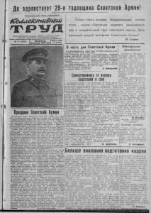 Да здравствует 29-я годовщина Советской Армии! П р о л е т а р и и в с е х с т р а н , с о е д и н я й т е с ь Ф й>иие$т ш $нш ё Т Р У Д Орг ан К а р а е у к с к о г о райкома В К П ( б ) и ра йо н н о г о С о в е т а д е п у т а т о в ^ т р у д ящих с я , Но в о с и б и р с к о й обла с ти № 1 1 ( 1025) Воскресенье, 23 февраля 1947 года Ц е н а н о м е р а 1 5 к о п е е к „Теперь перед нашими Вооруженными силами стоит... з а д а ч а— бдительно охранят ь з а в о е в а н н ы й мир и созидательный труд с о в е т с к о г о народа, б ы т ь надежной опорой ин тере со в С о в е т с к о г о С о ю з а " . И. Сталин. С Ш 4 щ‘Шш Праздник Советской Армии С е г о д н я н а ш н а р о д п р а з д н у е т 2 9 - ю ю д о в щ и н у Со в ( ТСКой Армии. С о в е т с к а я Армия—де т ище В е ликой Ок т я б рь с к о й с оциа лис т ич е с кой революции. Она была с о з дана Лениным и Сталиным в огне г р а жд а н с к о й войныи з а минувшие г о ды прошла пу т ь с л а в н ых побед. В войне 1 9 1 8— 1920 г о д о в Со в е т с к а я Армия под р у к о в о д с т в о м б о л ь ше в и к о в отс тояла великие ре в олюционные з а в о е в а ни я н а р о д а . Она на г о л о в у разбила в р а ж е с кие полчища, с т ремившие с я в о с с т а н о в ит ь в с т ране в л а с т ь капит а лис т ов и помещиков . Р а з г р ом ин т е рв е н т о в и б е л о г в а р д е йце в обеспечил нашему н а роду длительный мир. Под р у к о в од с т в ом партии Л е н и н а - С т а л и н а с о в е т с к ий народ вос с т ановил народное х о з я йс т в о , а затем, в г олы с т алин с ких пятилеток , о с у ще с твил с оциалис тич ес к ую инду стриализацию с траны и к о л л е к т и визацию с е л ь с к о г о х о з я й с1 ва. Из о т с т а лой и слабой наша с трана пре в ра т ила с ь в мощную инду- е т риа л ь но - к олх о з ную, социалис тич е с к ую де ржа в у . В с е эти г оды С о в е т с к а я Армия т в е р д о стояла на с т р аже с оциа л и с т и ч е с к о г о с т р ои т е л ь с т в а , а н а род вс е ме рн о укреплял свои во- ор\же нные силы. В Ве лик ой О т е ч е с т в е н н о й в о й не против фашис т с ких з а х в а т ч и к о в в а ша армия с ч е с т ь ю о п р а в дала над ежды, к от орые в о з ла г ал на нее народ Один на один она н е с к ол ь к о л е т ге ройс ки сража ла с ь с г ит ле ровс кими ордами, пе р е д кот орыми не у с т о я л а до то г о времени ни одна армия на е в р о пейс ком к о н тин е н т е . Она в ы д е р жала б еше н ый на т и с к в р а же с к и х сил. Под р } к о в о д с т в о м нашег о г е ни а л ь н о г о полков одца Г е н е р а лис симус а С о в е т с к о г о Союза т о варища Ст алина в а ш а армия р а з била в р а г а , очис тила от о к к у п а н т о в в с е с о в е т с к и е з емли, п р и н е с ла о с в о б о жд е н и е народам Е в р о пы, в одру зила знамя победы над Берлином. С о в е т с к и е в ооруже н ные силы одержали б л е с т ящу ю победу и на д империалис тичес кой Японией. В честь дня Советской Армии В с о ц и а л и с т и ч е с к о м с о р е в н о в а н п и в ч е с т ь 2 9 - й г о д о в щ и н ы С о в е т с к о й А р м и и к о л л е к т и в р е м о н т н о й м а с т е р с к о й с о в х о з а и и е н а Д з е р ж и н с к о г о д о б и л с я х о р о ш и х п о к а з а т е л е й . О б я з а т е л ь с т в о р е м о н т н и к о в —о т р е м о н т и р о в а т ь в с е т р а к т о р ы к 2 3 ф е в р а л я в ы п о л н е н о д о с р о ч н о . 2 0 ф е в р а л я н а л и н е й к е с т о я л и в с е 1 0 м а ш и н . К а ч е с т в о р е м о н т а х о р о ш е е . П о с т а х а н о в с к и т р у д и т с я н а р е м о н т е б р и г а д а м о н т а ж н и к о в п о д р у к о в о д с т в о м т о в С у м к о Н е п л о х о р а б о т а ю т т р а к т о р и с т т о в . Г а й д а р е в , с л е с а р ь т о в . Ц е х о н я в ы п о л н я ю щ и е п о п о л