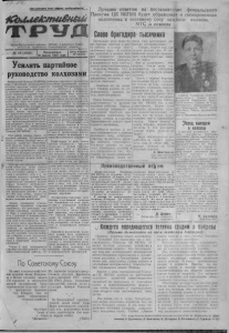 П р о л е т а р и и вс е х стран, соед иняйтесь Орган Ка ра с укс к ог о райкома ВКП( б) и районног о Совета д еп у т а т о в т рудящихс я , Но в о с и б и р с к о й области № 1 6 ( 1 0 3 0) Вос к рес е нье , 16 м а р т а 1 9 4 7 г о д а Ц е н а н о м е р а 1 5 к о п е е к Усилить партийное руководство колхозами Февральский Пленум ЦК ВКП(б) перед партийными организациями поставил с ерьезные задачи в деле коренного у л у чше ни я рук о в о д с т ва сельским хозяйством: . Т е п е р ь , после перехода к мирному с т роительству, перед нашей партией и государством снова во ве с ь рост встала, как самая неотложная з а д а ч а , —обеспечит ь такой под' ем сельского хозяйства, который п о з волил бы в кра т чайший срок создать обилие продовольствия для нашего населения, сырья для легкой промышленности и накопление необходимых государс т венных продовольственных и с ыр ь е вых ре з е рв ов ' ' . Путь к выполнению этой жизненно необходимой задачи указ ан в постановлении Пленума ЦК ВКП(б) . • Наш район, являясь одним из крупных районов Кулундинской степи, занимает большое место в сельском хоз яйс т ве Но в о с ибир ской области. Перед т рудяшими ся района стоит огромная задача повышения урожайнос ти пше ницы в таких р а з ме р а х , к о т о рые б у дут мощным вкладом в д ело с о з дания обильных фондов хлеба в нашей стране. Поэтому для партийных оргаяи з зций сейчас нет более важной з адачи, как решительно преодоле ть отставание района в яодг о товке к весевнем у севу и в за воевании высокого у р о ж а я . Б о л ь шевистская партия и советское правительство оказывают нашему району большую материально техническую помощь. Партийные организации в ооружены конкрет ной программой действие на ряд ле т . Вое дело теперь зависит от умения по- большевист ски руко водить сельским хозяйством. Однако проше дшие отчетно- выборные партийные собрания показывают , что некоторые п е р вичные партийные организ ации, их бюро и с екре т а ри не с п р а в и лись с задачами большевистского руководства колхозами, не о с о з нали всей ответственности, ко т о рая встает перед партийными о р ганиз ациями и их ' руководящими органами за организационное и экономическое укре п ле ние колхозов. Не случайно отчетно выборные собрания в этих парт орг а низ ациях признали ра бот у своих бюро и с екре т арей неудовле тво рительной. Только в силу запущенности партийно- организационной и п а р тийно- политической работы, осЛучшим ответом на постановление февральского Пленума ЦК ВКП(б) будет образцовая и своевременная подготовка к весеннему севу каждого колхоза, М'ГС и со в х о за Слово бригадира-тысячника лабления парт ийног о руководства парт ийных организаций, колхозы им Калинина Не с т еровск ог о сель- с о в - ' и „Победа" и „ Смерть к а питалу" ока з алис ь в не п риг ляд ном положении. Они допустили ог ромный г а д е ж скота, большие потери хле' а, не выполняю) п е р вой заповед и пе ре д государством, не ра считмваются но поставкам с е ль с кохо з , йственных продуктов. Отдельные парт ийные орг а низ а ции мирил) сь с фактами н е к о н кретного руковод с т ва сельским хозяйством со стороны советских органов на местах, правлений кол хозов и т. д. Вследствии этого ряд сельских советов и кол х о з о в становились на путь голого а дминис т рирования , оторвались от масс и пре вра т илис ь в деляг, ничего обще г о не имеющих с инт е р е с а ми сове т с к ог о государства. 